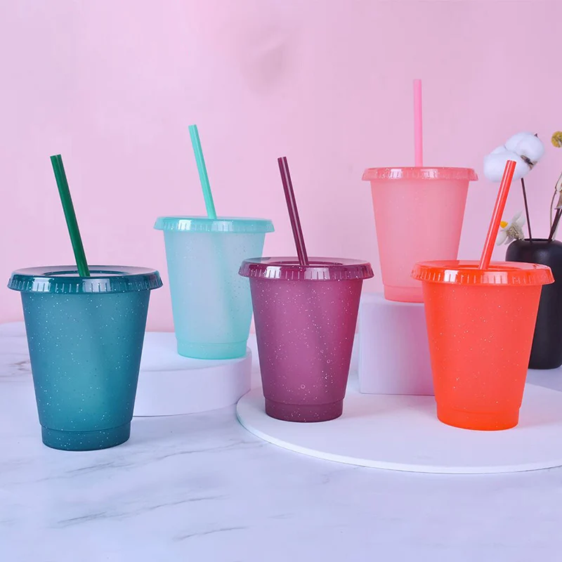 Z pokrywką i słomką: błyszczący plastikowy kubek wielokrotnego użytku z pokrywką i kubek ze słomką.