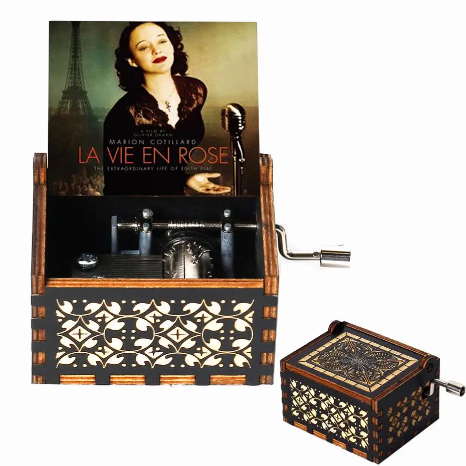 Antyczna drewniana ręka łukowaty czarny kolorowy nadruk moje serce pójdzie na La Vie En Rose pozytywka dekoracja urodzinowa