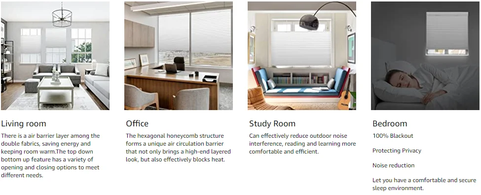 Bezprzewodowe rolety do okien, łatwe do zainstalowania i zawieszenia. Bezprzewodowa konstrukcja jest nie tylko schludna i piękna, ale także chroni bezpieczeństwo dzieci i zwierząt domowych. Bezprzewodowe żaluzje komórkowe są łatwe w użyciu. Delikatnie popchnij lub pociągnij w dół, możesz pociągnąć kurtynę do dowolnej pozycji. Dostępne są trzy rodzaje otwieranie i zamykanie, aby zaspokoić potrzeby dotyczące światła, prywatności lub obu. Odcienie zaciemniające nadają się do salonu, gabinet, kuchni, sypialni i biura