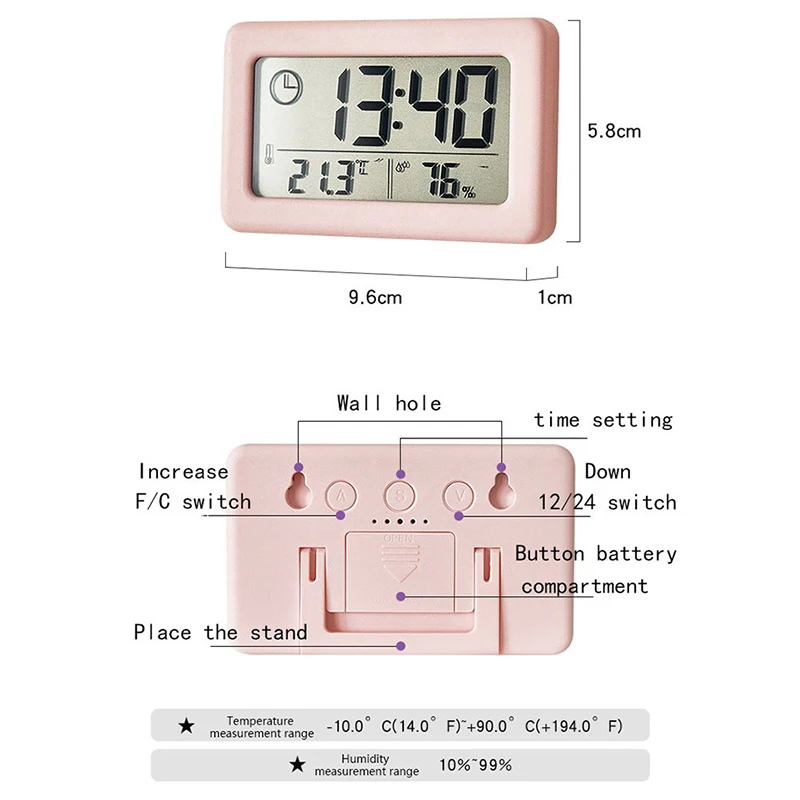 Funkcje: wyświetlacz temperatury, wyświetlacz wilgotności, czas, 12/24 godzin