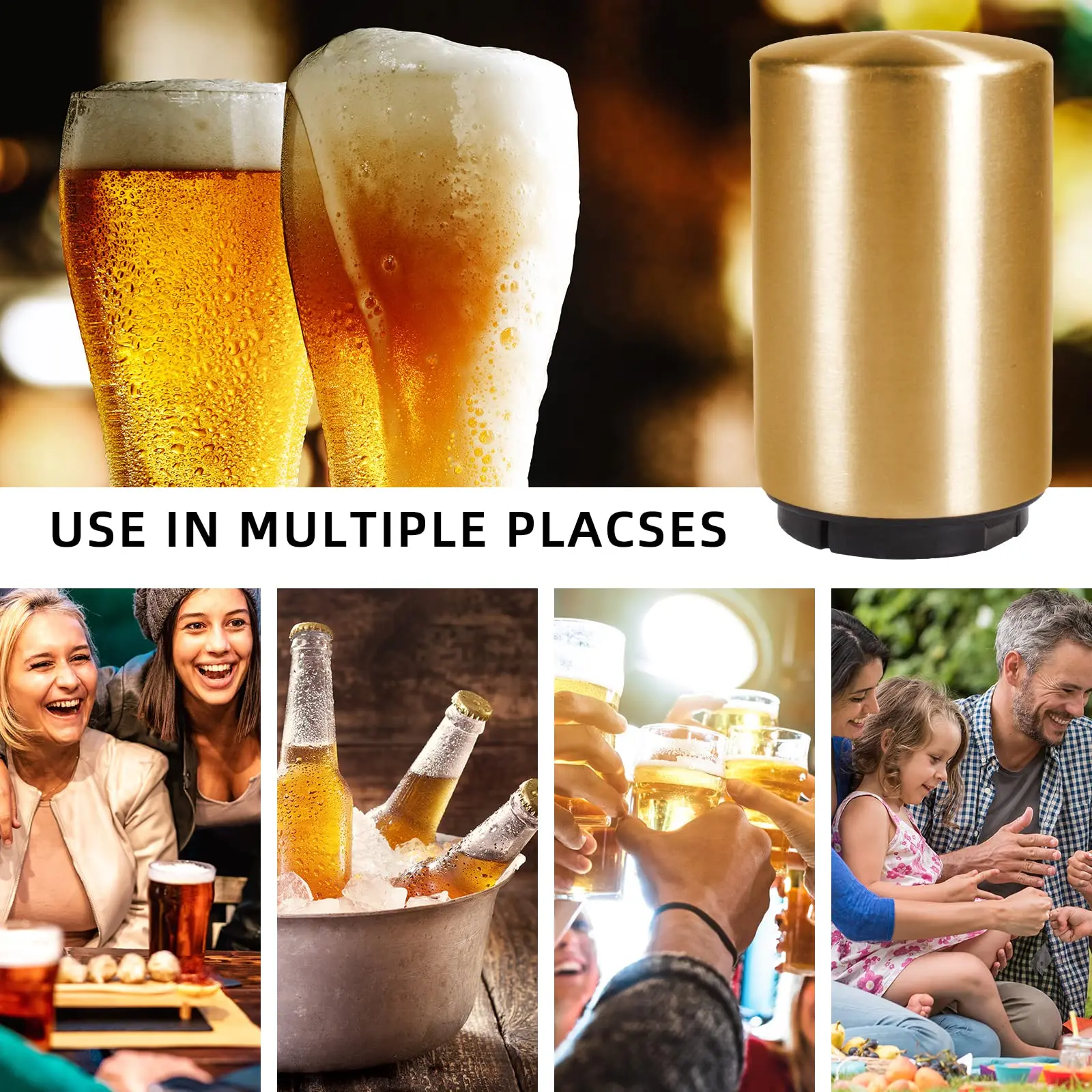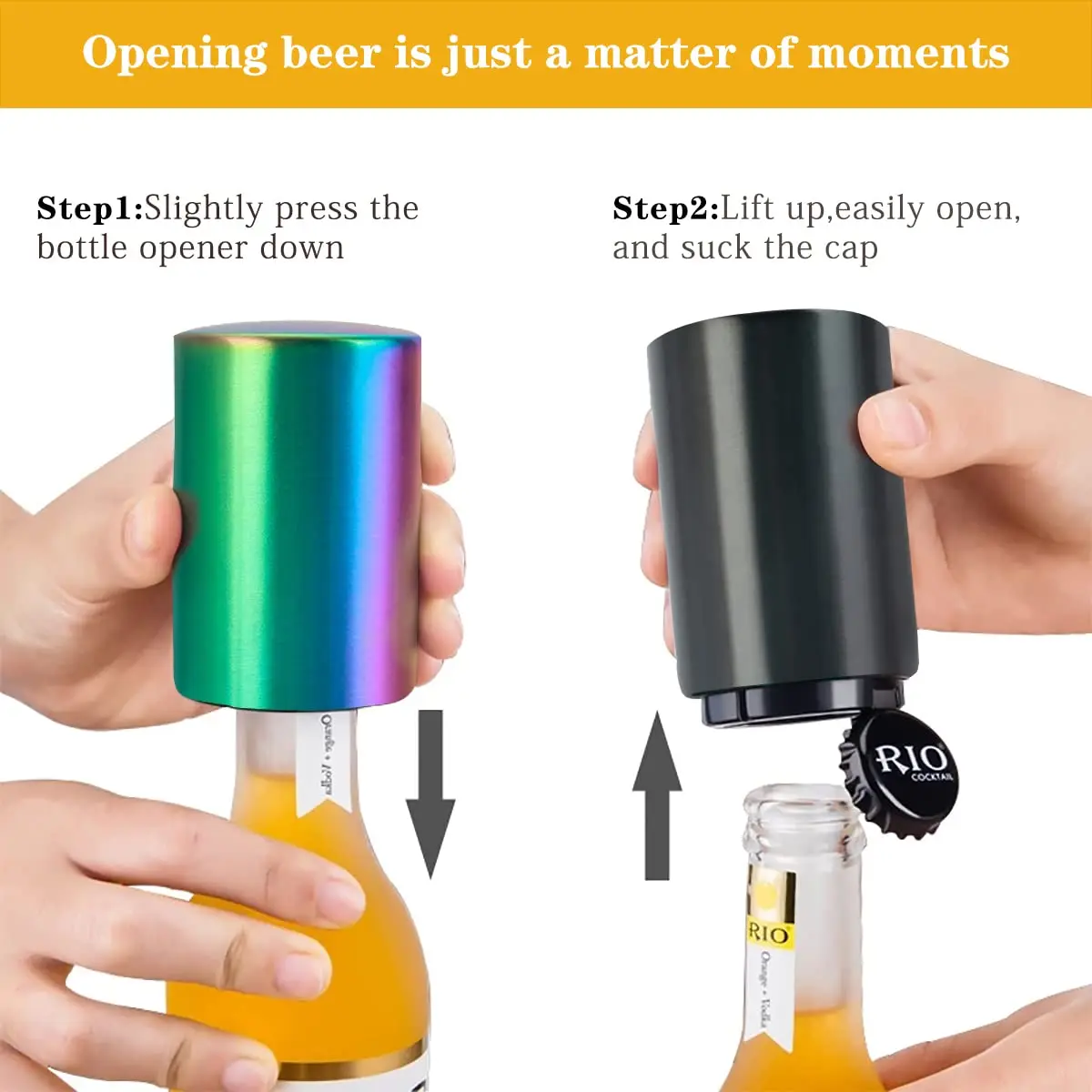 【Prosty sprężynowy otwieracz do butelki】 po prostu umieść ten automatyczny otwieracz do butelek na otwieracz butelek, naciśnij go do końca, a następnie wyskocz. Za pomocą magnesu nasadka jest łatwo wyjmowana z butelki nawet jedną ręką! Idealny do piwa, sody i szklanej butelki.