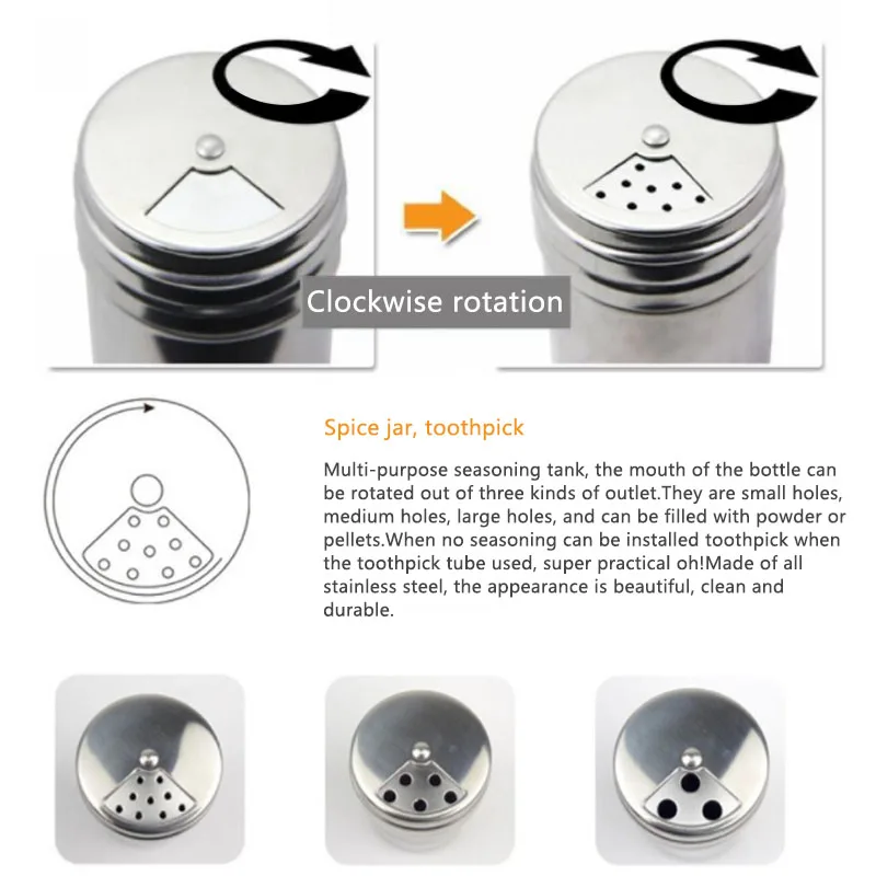 Unikalna obrotowa konstrukcja porowatej struktury: obróć, aby wybrać trzy selektory wielkości na górze wytrząsarki, aby rozprowadzić przyprawy o różnych stopniach szlifowania, które mogą być używane do wszystkich przypraw proszkowych