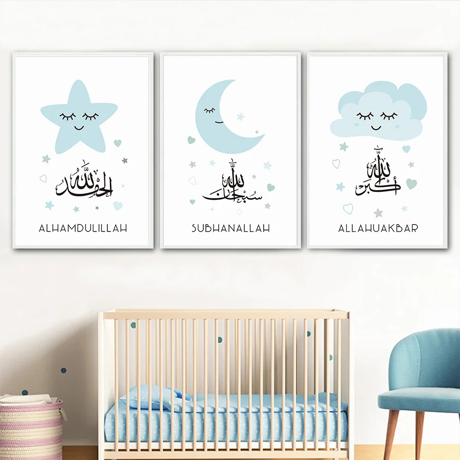 Islamski Allahu Akbar księżyc gwiazdy różowy niebieski zielony dzieci przedszkole płótno malarstwo plakat na ścianę zdjęcie z nadrukiem dziewczyny wystrój pokoju dziecięcego