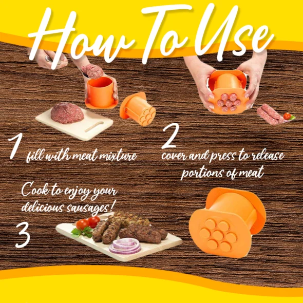 • Łatwy w użyciu-Po prostu włóż zmielone mięso do środka i włóż docisk. Naciśnij kciuki i ciesz się szybkimi kiełbaskami!