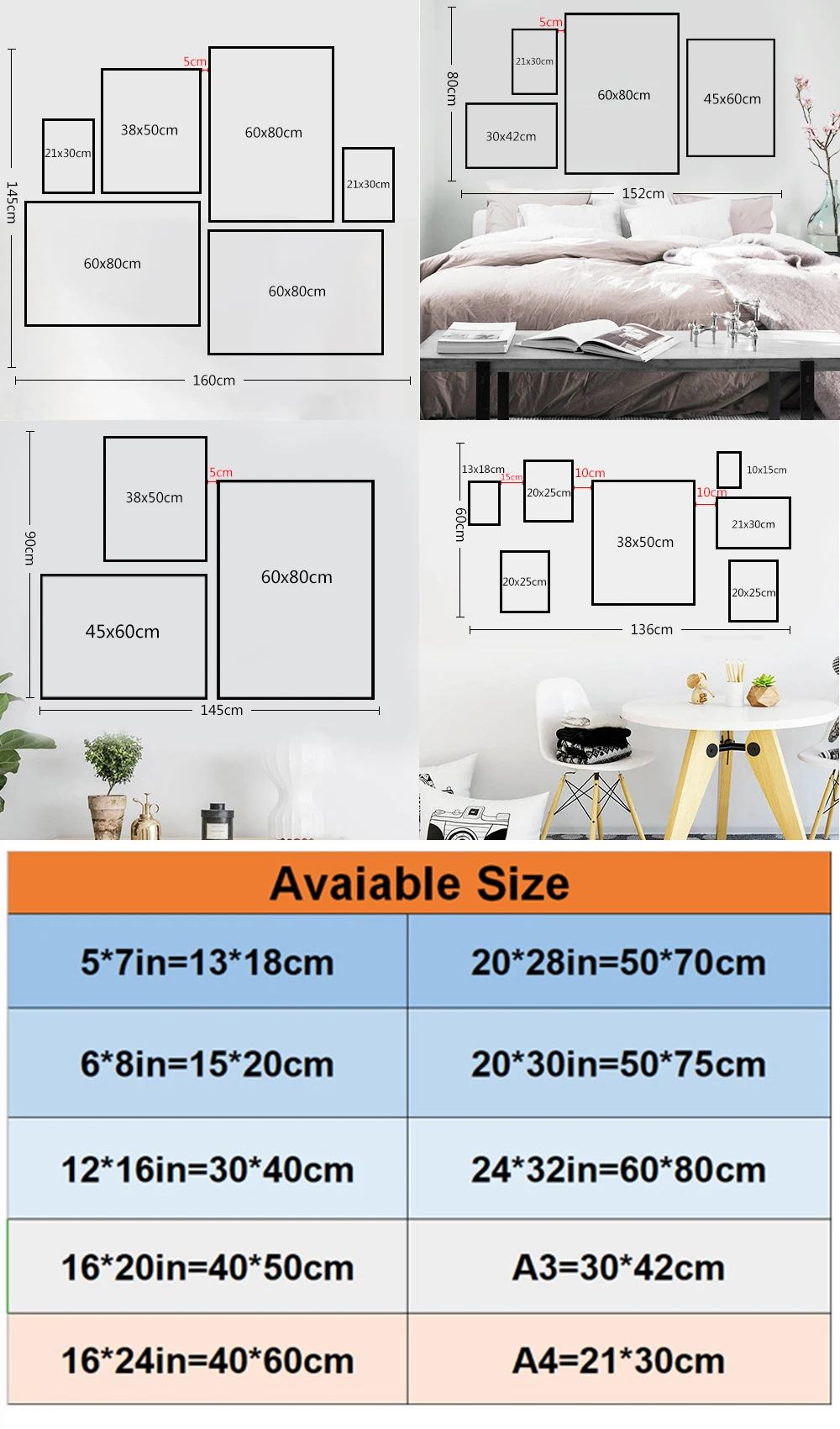 5 o produto não tem moldura, por isso viagens de longa distância pode causar danos. Nossos tamanhos são todos os quartos. Você pode facilimente combinar o quadro.