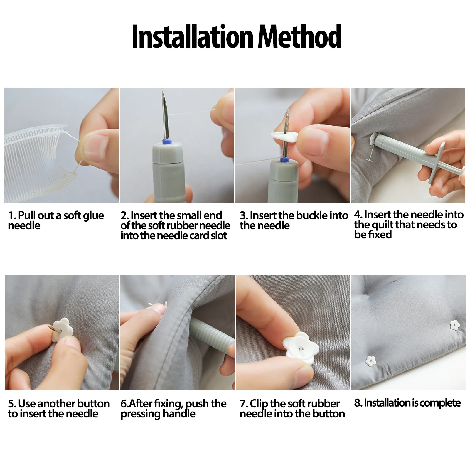 3, otwieranie i zamykanie asy: unikalna konstrukcja klipsa na narzuta ułatwia ich naprawienie i demontaż w ciągu kilku sekund. Klips na kołdrę jest wyposażony w dwie różne długości (15mm / 25mm) z miękkich igieł silikonowych, które mogą zaspokoić potrzeby różnych grubości kołdry w różnych porach roku.