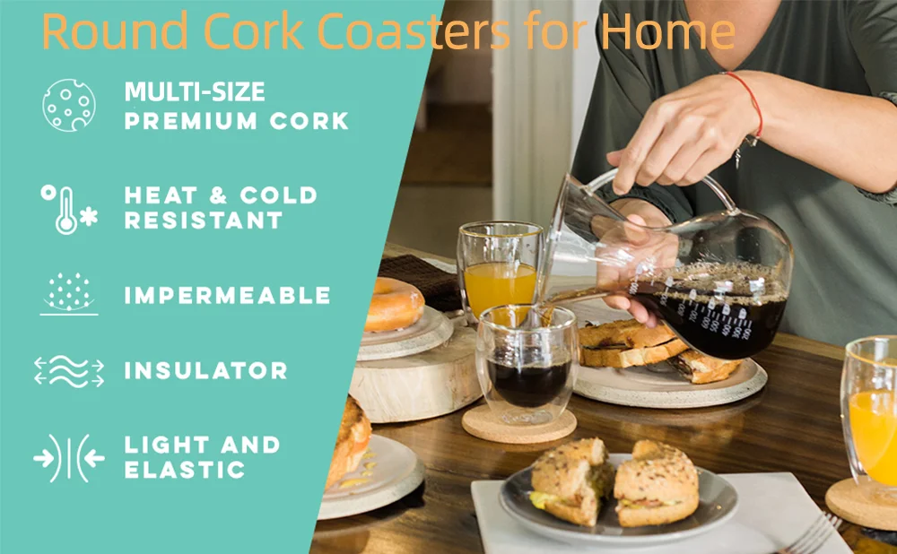 Korzystanie z naszych podstawek korkowych pomaga chronić blaty stołowe i inne powierzchnie przed uporczywymi plamami i wyciekami z pierścienia wodnego. Te dobrze wykonane podstawki na napoje zawierają gorące lub zimne napoje w kubkach, kubkach, szklankach, butelkach itp