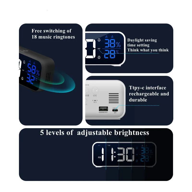 11. Sterowanie głosem: ekran automatycznie zgaśnie po 6 sekundach w odłączonym i cichym otoczeniu, dotknie pulpitu lub wyda dźwięk 90 decybeli (klaskanie lub kaszel itp.) aby obudzić budzik