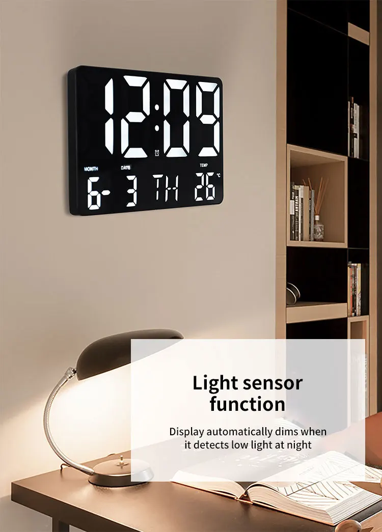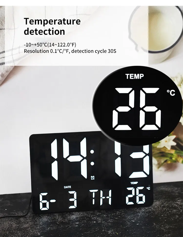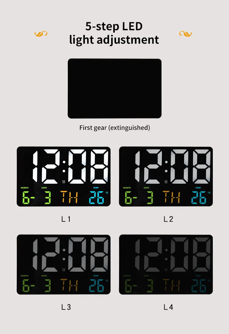 5. Duży wyświetlacz LED, jasność można regulować ręcznie, a poziomy regulacji to: off, niska jasność, średnia jasność i wysoka jasność. Może być również automatycznie przyciemniony przez indukcję światła. Po włączeniu tej funkcji produkt automatycznie dostosuje jasność wyświetlacza do jasności otoczenia.