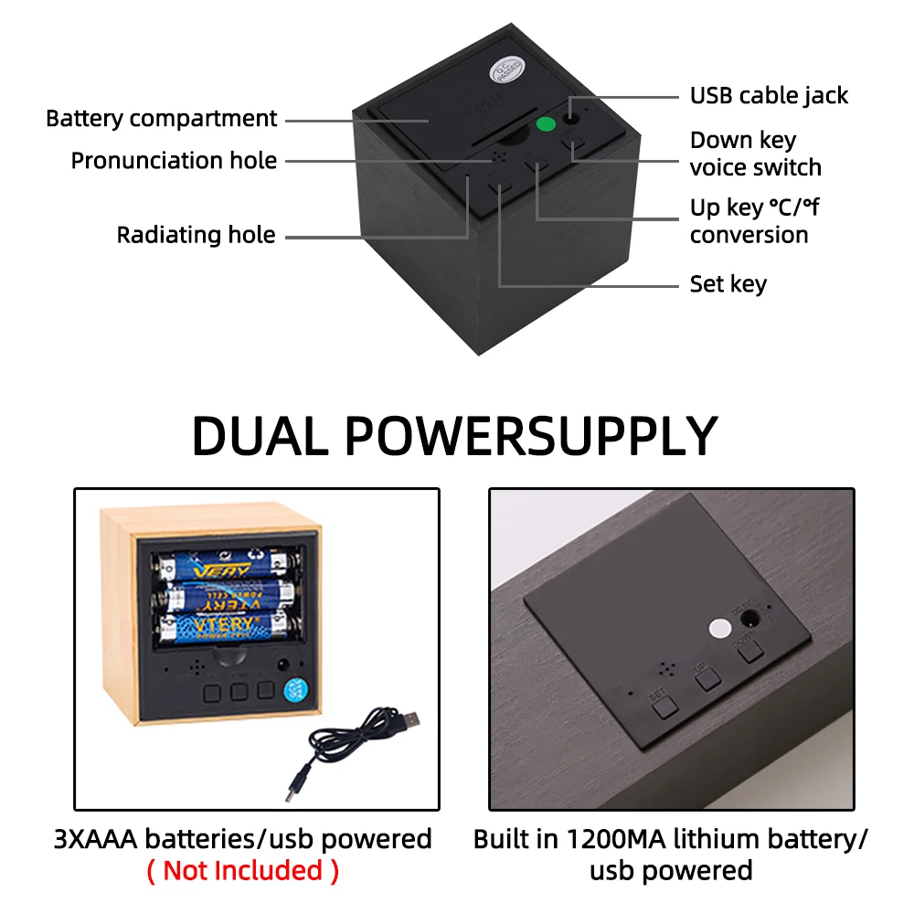 Uwaga:Zaleca się stosowanie zasilacza 5V, 1A. Ten budzik ma wbudowany akumulator, który można podłączyć lub odłączyć.