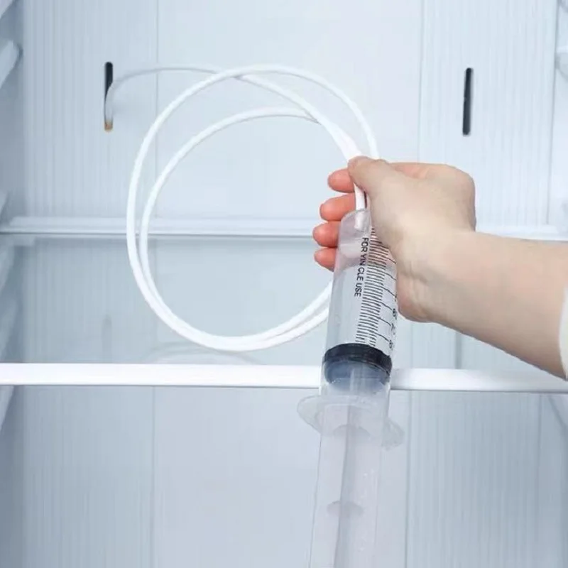 1. Przed użyciem wyłącz lodówkę i włóż rurę do otwory spustowe.
