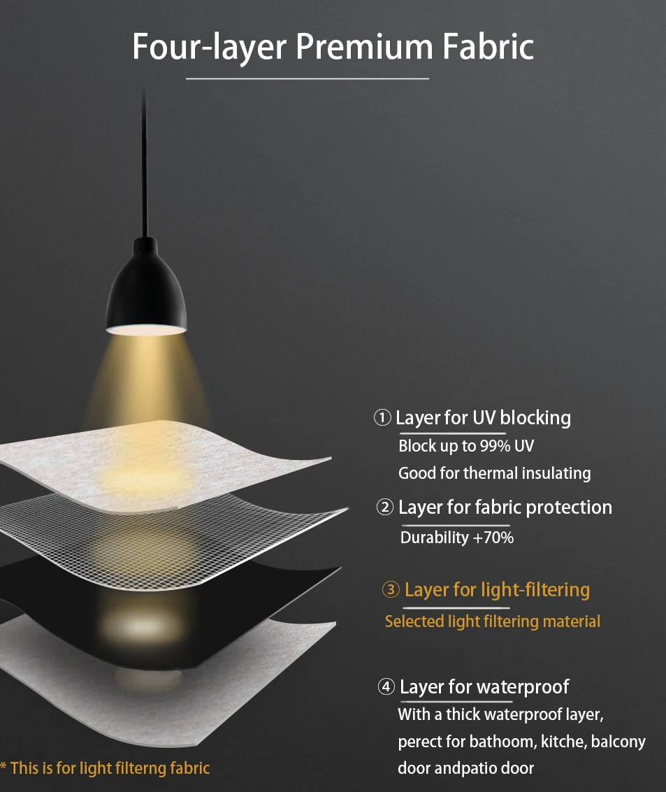 Najwyższej jakości tkanina filtrująca światło jest wystarczająco mocna i trwała, aby wytrzymać odkształcenia. Krawędź tkaniny jest super równa, ładnie wygląda.