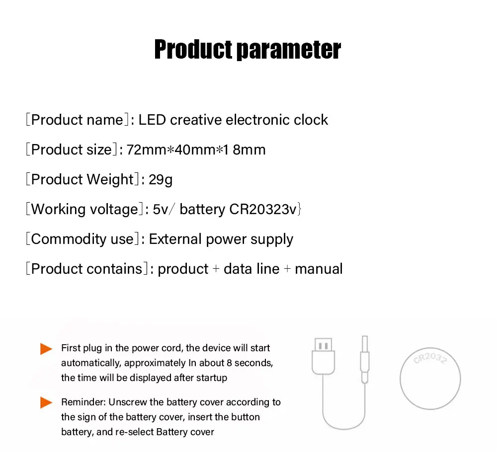 1 x LED clock1 x kabel USB 1 x instrukcja obsługi (zdjęcia wyjaśniające