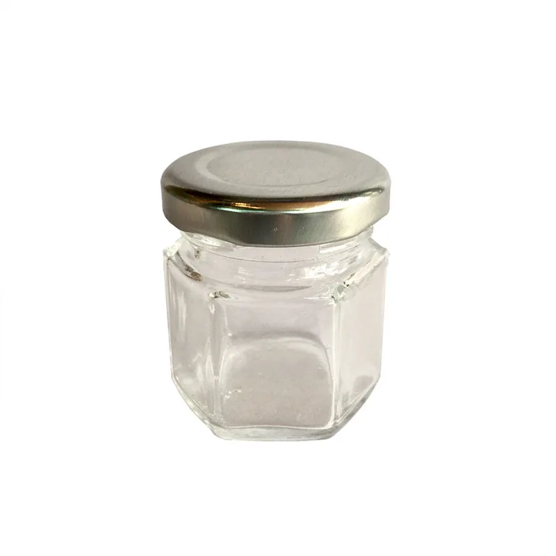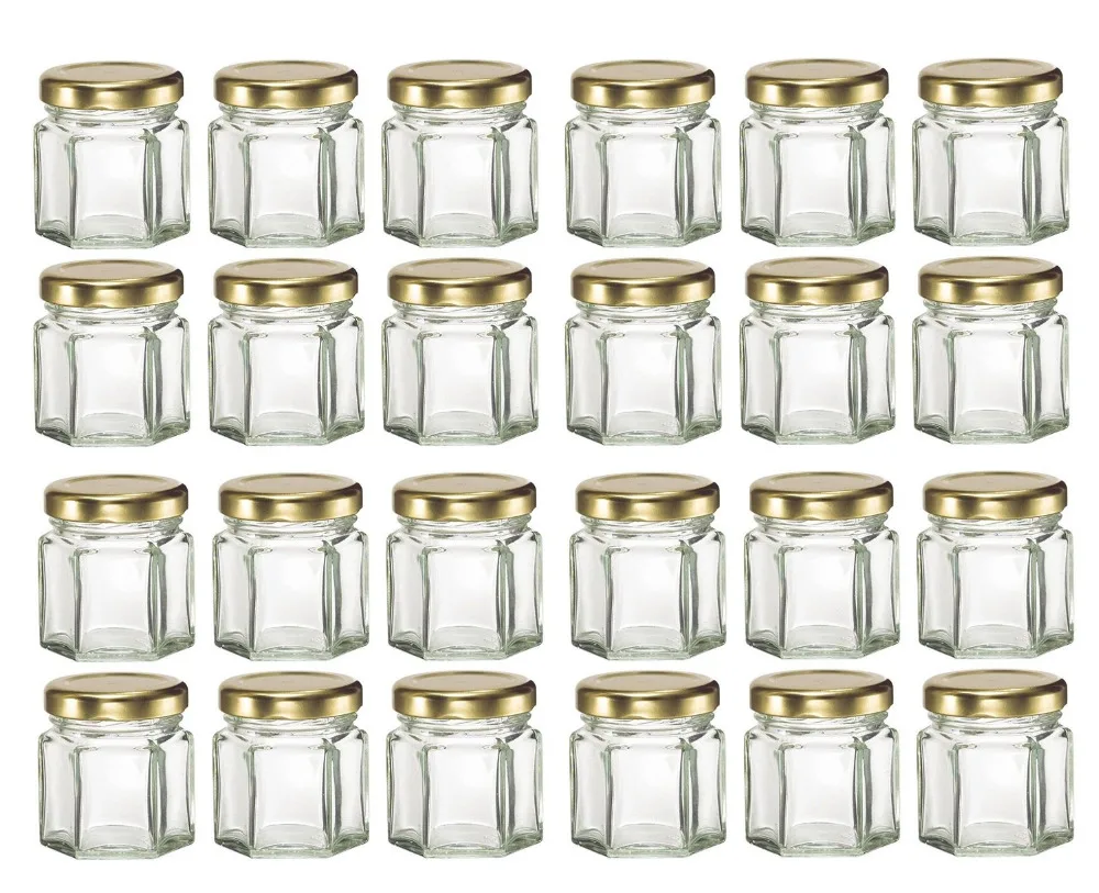 Luzem 24 sztuk 1.5 uncji 45ml Mini sześciokątne szklane słoiki ze złotem/srebrem/czarne pokrywki, na dżem, miód, cukierki, przyprawy dżem