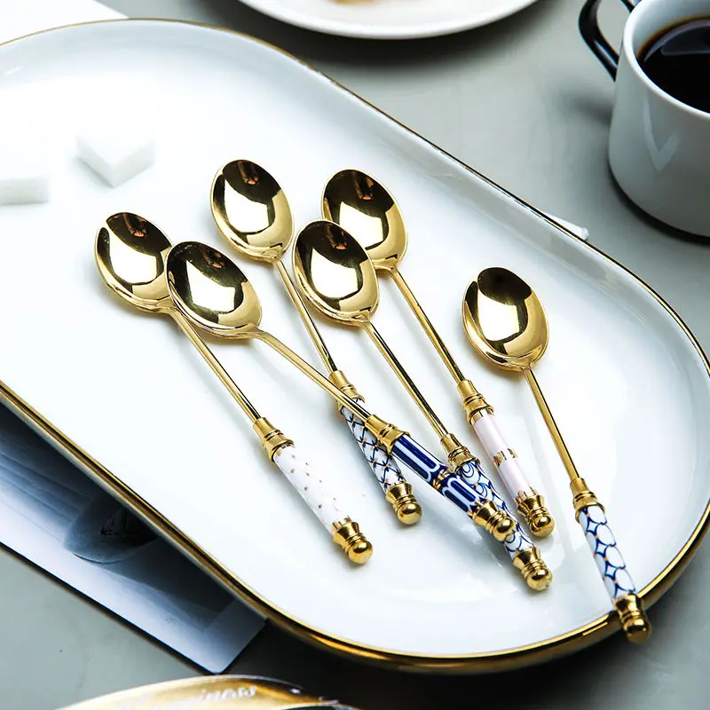 Łyżeczka do deserów ze stali nierdzewnej ceramiczna długa rączka lody łyżka łyżeczka złota kawa ciasto owoce mleko łyżka zastawa stołowa do kuchni