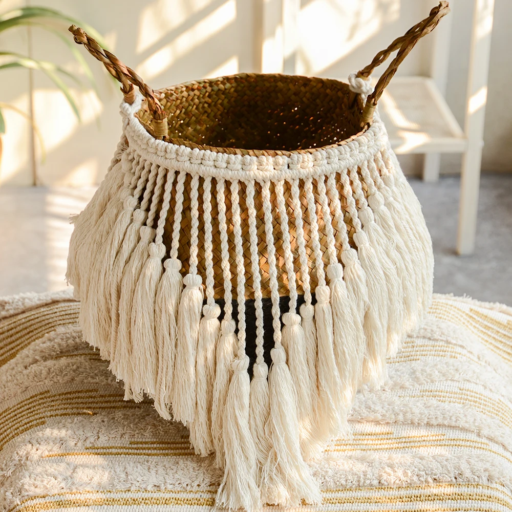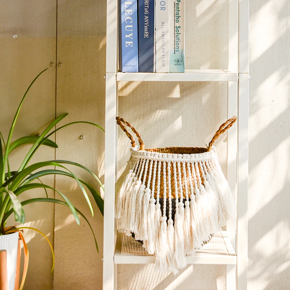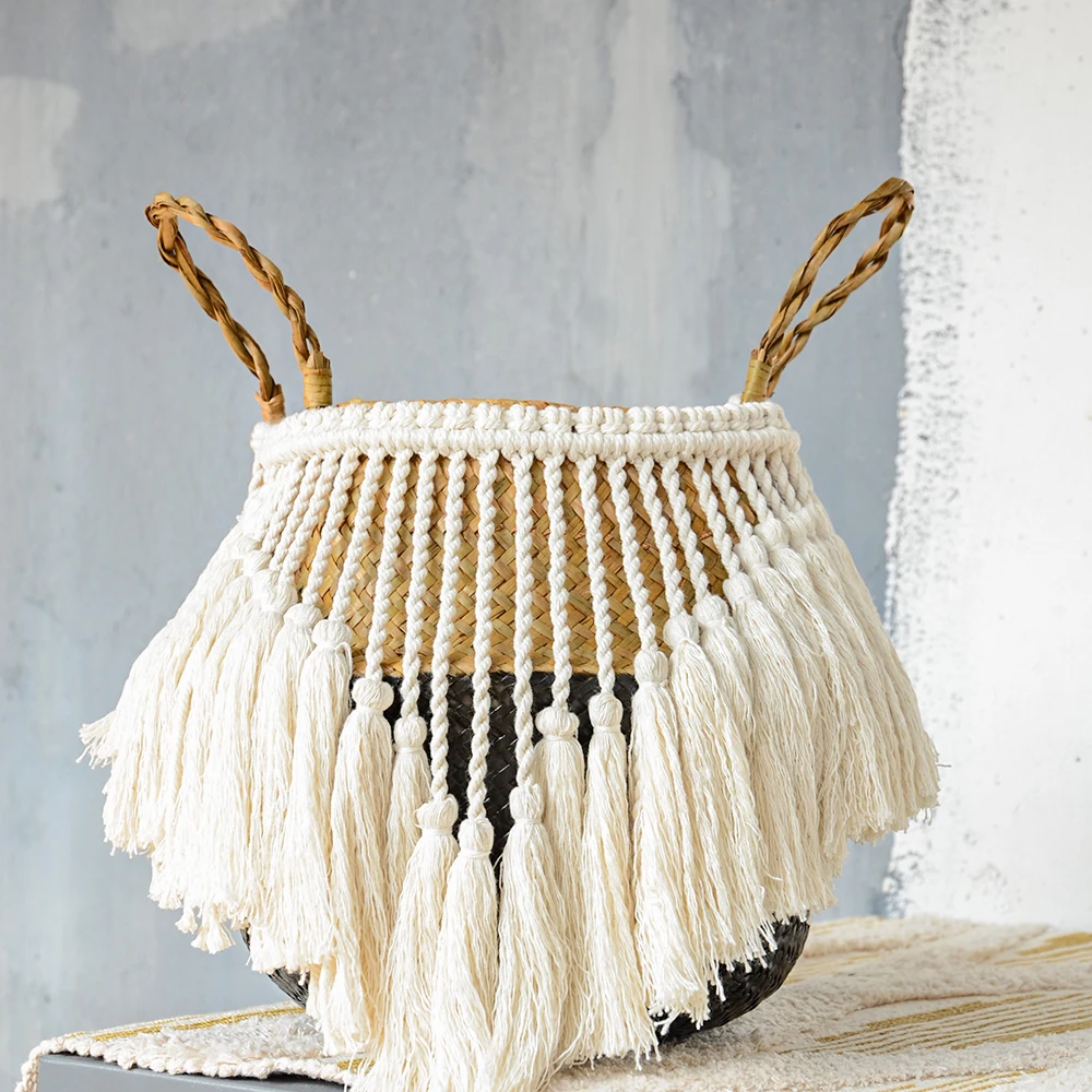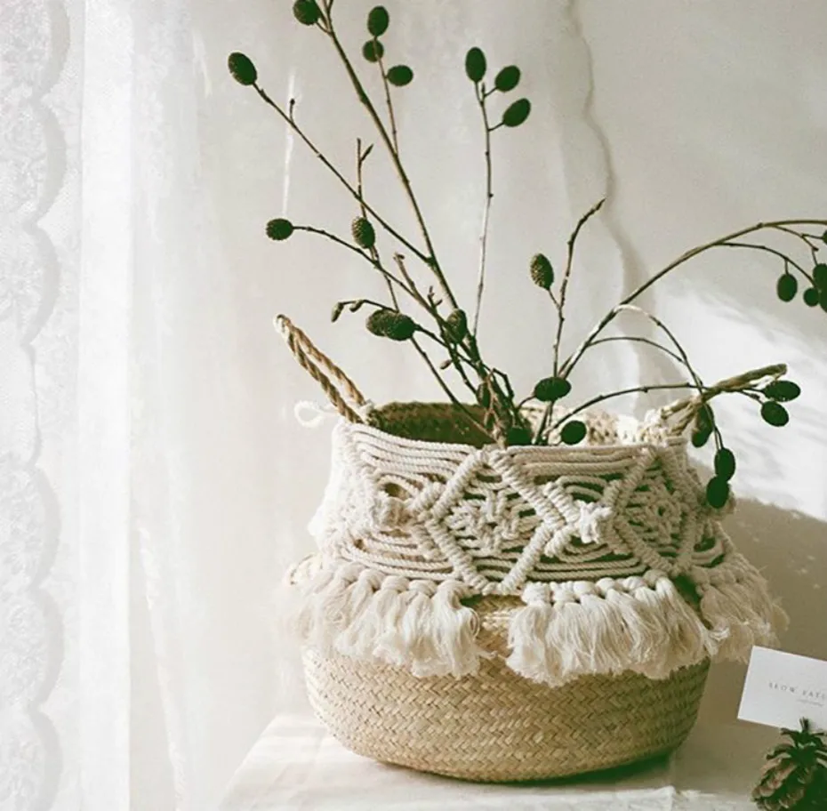 Uwaga: zawieszka z makramy jest przymocowana do uchwytu kosza zamiast być przywiązana wokół kosza.