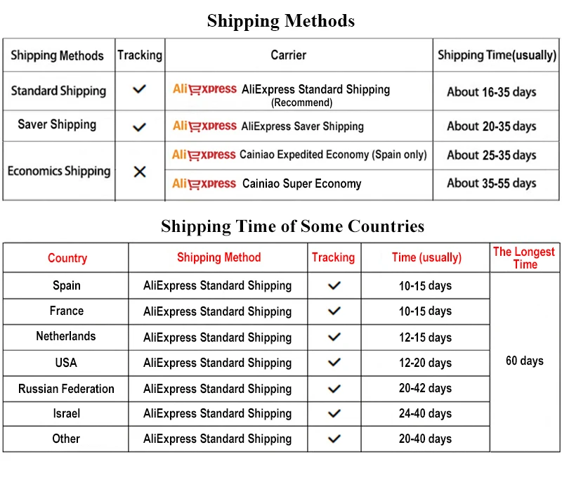 2. Produkty są wysyłane z chin za pomocą poczty lotniczej, dotrzeć do większości krajów w ciągu 15 do 30 dni roboczych.