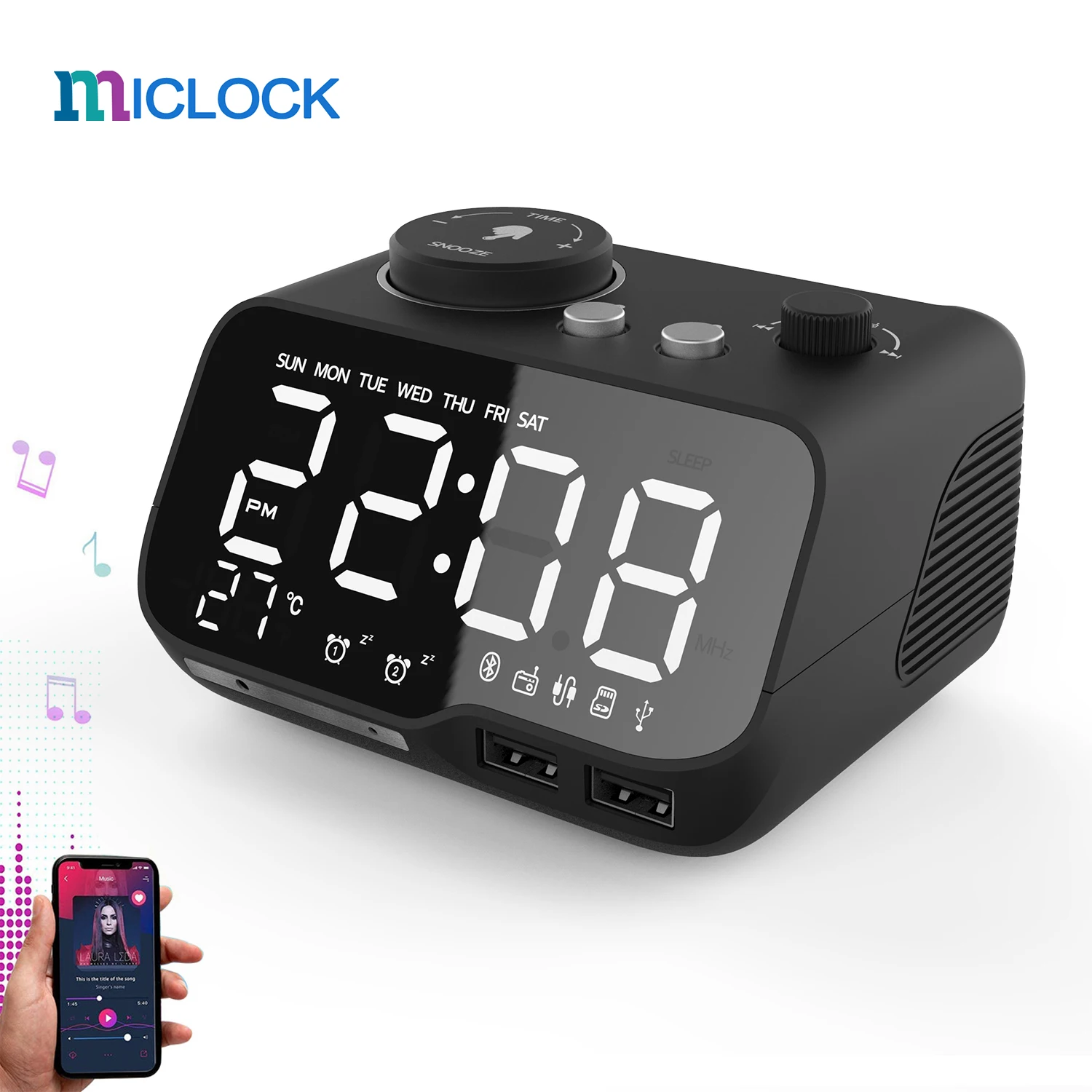 Alarm 1 to alarm tygodniowy (od poniedziałku do piątku, od poniedziałku do soboty lub od poniedziałku do słońca) ,Alarm 2 to jednorazowy alarm premium. Obudź się z ulubioną stacją FM lub muzyką z karty TF lub wbudowanym klasycznym brzęczykiem. Funkcją drzemki jest aktywowany przez naciśnięcie duży przycisk i pozwala na dodatkowe 5 minut snu dla ciężkich podkładów