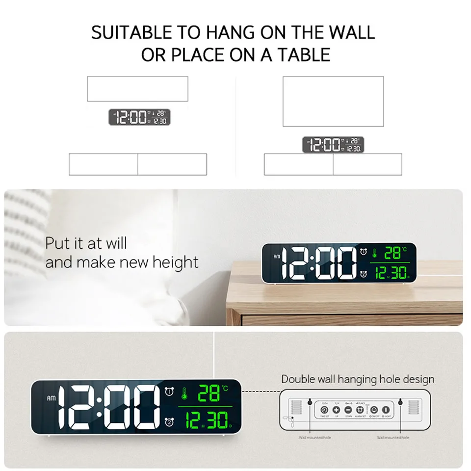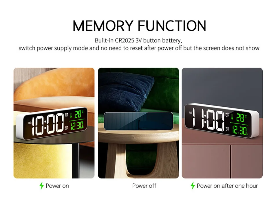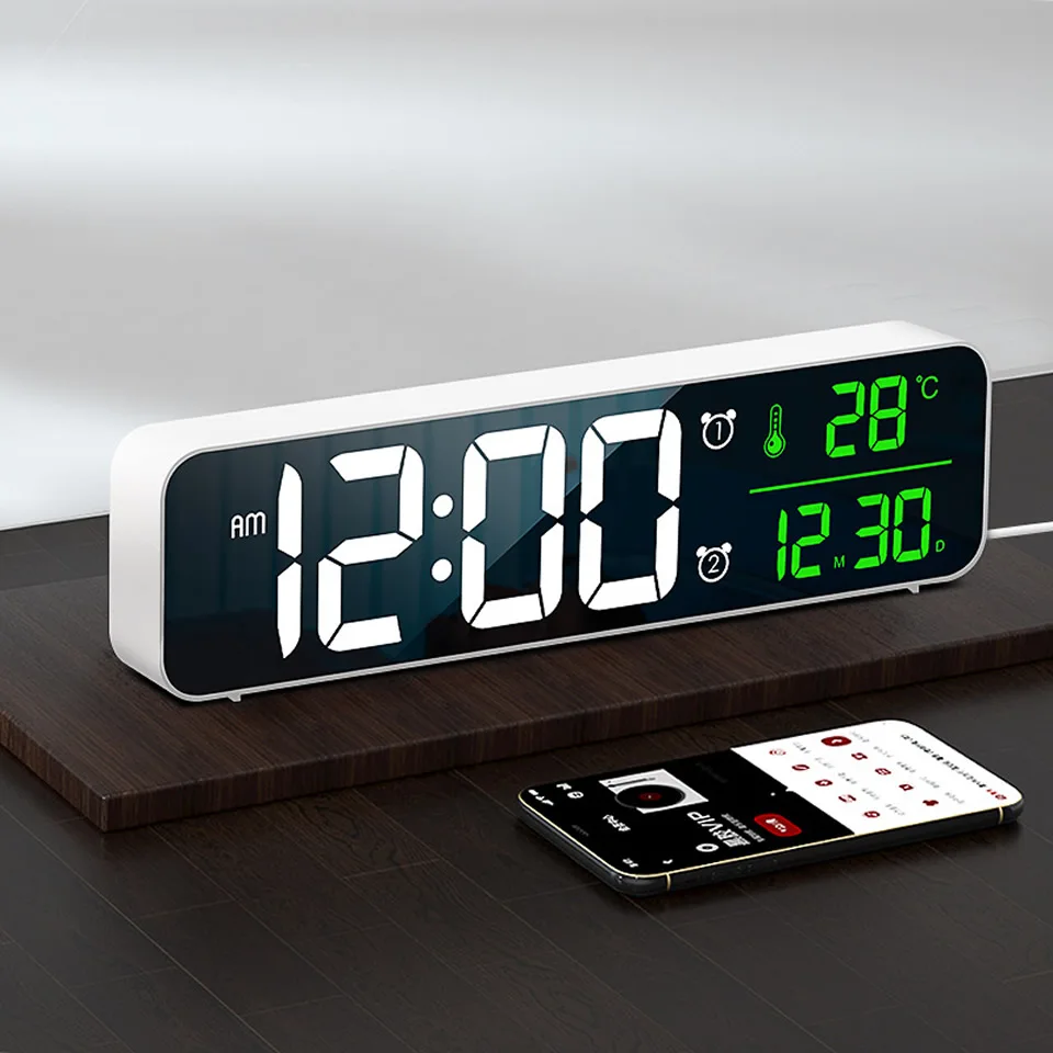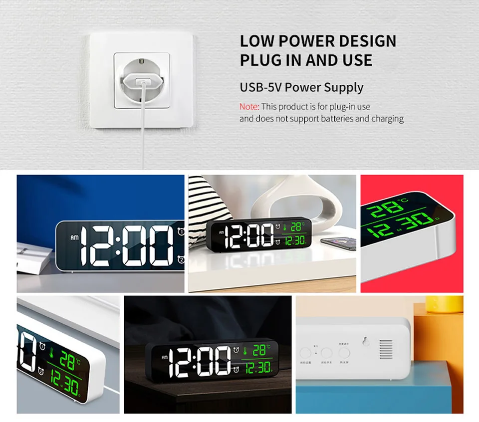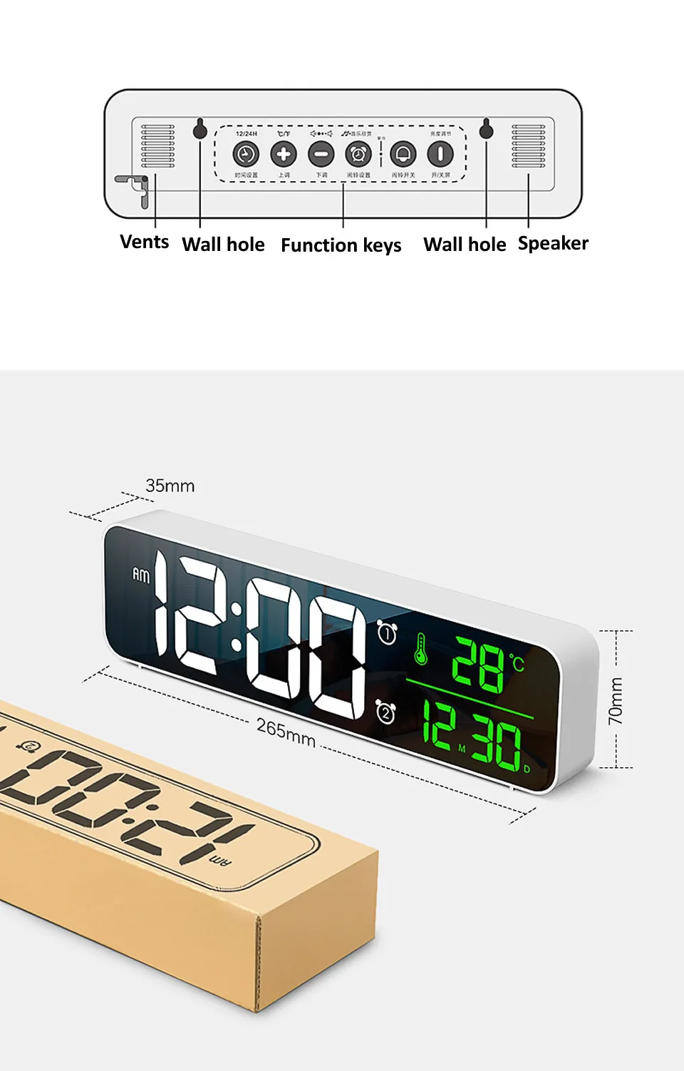 Duży wyświetlacz ledowy odczytuje w czasie rzeczywistym z duża odległość, ten budzik elektroniczny ma temperaturę (° C / ° F), datę, godzinę (12/24 godziny), 2 alarmy.