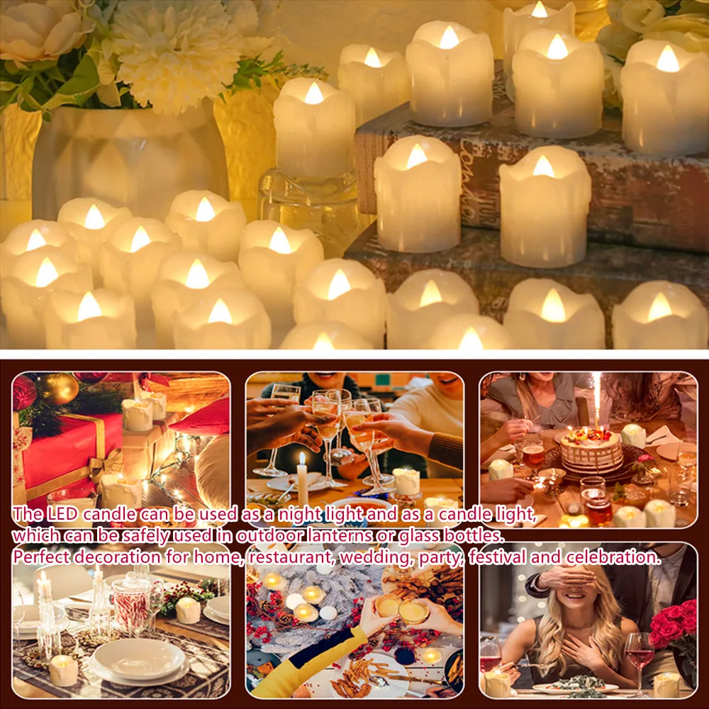 * Idealny do dekoracji, takich jak urodziny, imprezy, wesela lub inne uroczystości w nocy. Wyglądają jak prawdziwe podgrzewacze, ale używają wydajnego światła LED, aby symulować płomień świecy. Żarówki LED mają długotrwałą żywotność. 24 świece w jednym opakowaniu z zainstalowanymi bateriami litowo-jonowymi.