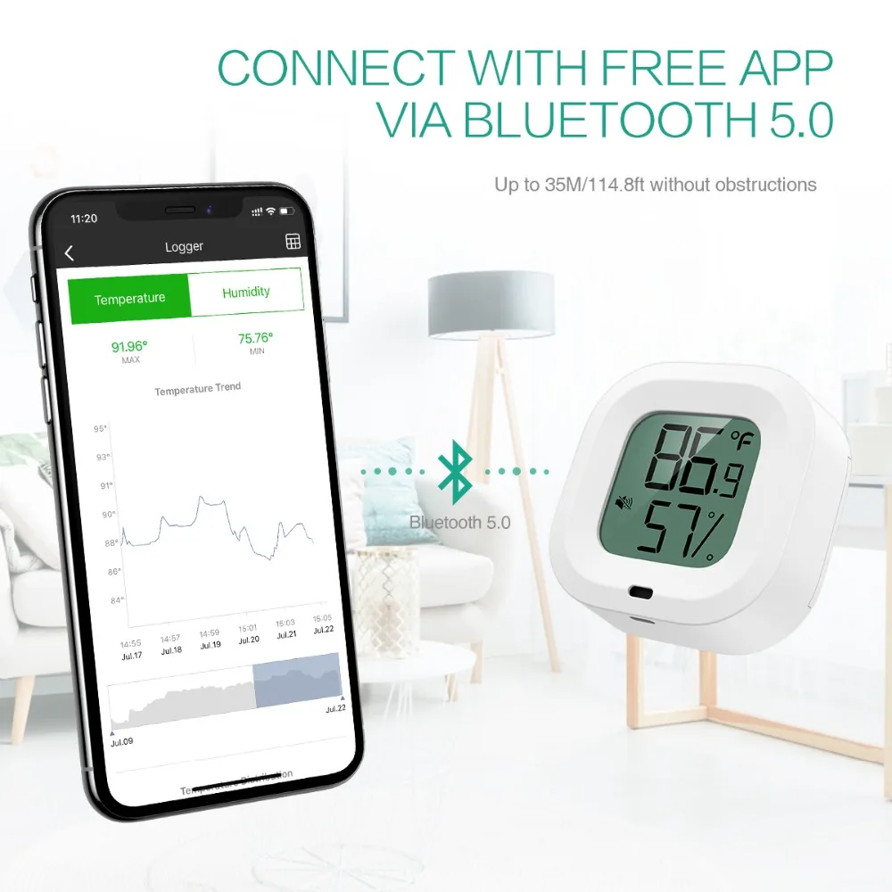 【Połączenie bezprzewodowe Bluetooth 】 użyj układu Bluetooth 5.0. Łatwo monitoruj dane dotyczące temperatury i wilgotności na niebieskiej aplikacji czujnika (bezpłatne pobieranie ze sklepu App Store lub Google Play) przez Bluetooth.
