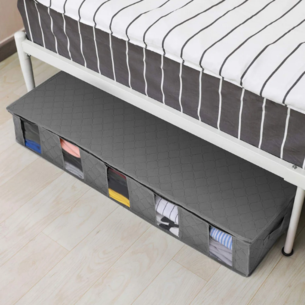 Pod łóżko worek do przechowywania wykonane z wytrzymałego włókniny z kilkoma przezroczyste okienko widoki i przenoszenia uchwyty dla łatwego dostępu. Funkcja odporny na kurz sprawia, że jest również bardzo przydatne dla małych przedmiotów, takich jak odzież.
