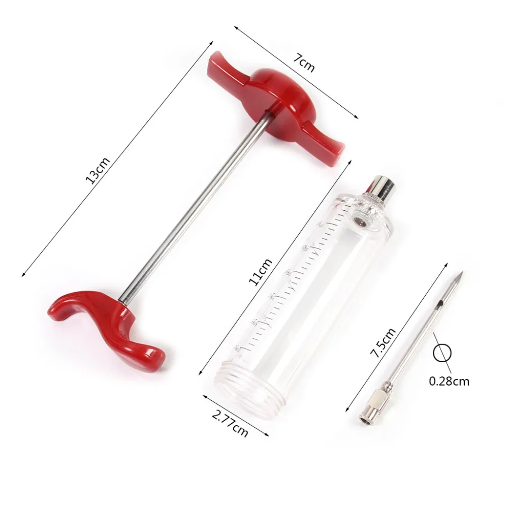 Aby uzyskać najlepsze wyniki, nasmarować beczkę przed użyciem wtryskiwacza i umyć po każdym użyciu, aby uniknąć bakterii. Ten wtryskiwacz do marynaty ma stopniowaną komorę wtryskową i końcówkę wtryskiwacza ze stali nierdzewnej. Dla ułatwienia czyszczenia demontuje.