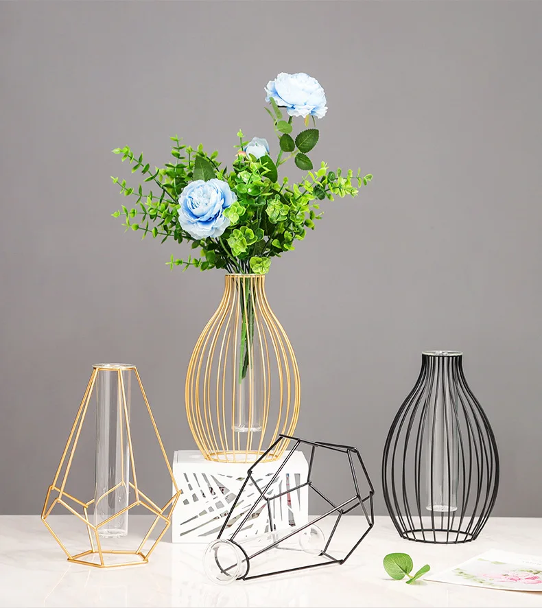 Prostota w stylu nordyckim złoty szklany wazon roślina hydroponiczna wazon na kwiaty żelazo geometryczna szklana probówka zakład metalurgiczny uchwyt nowoczesne dekoracje do domu
