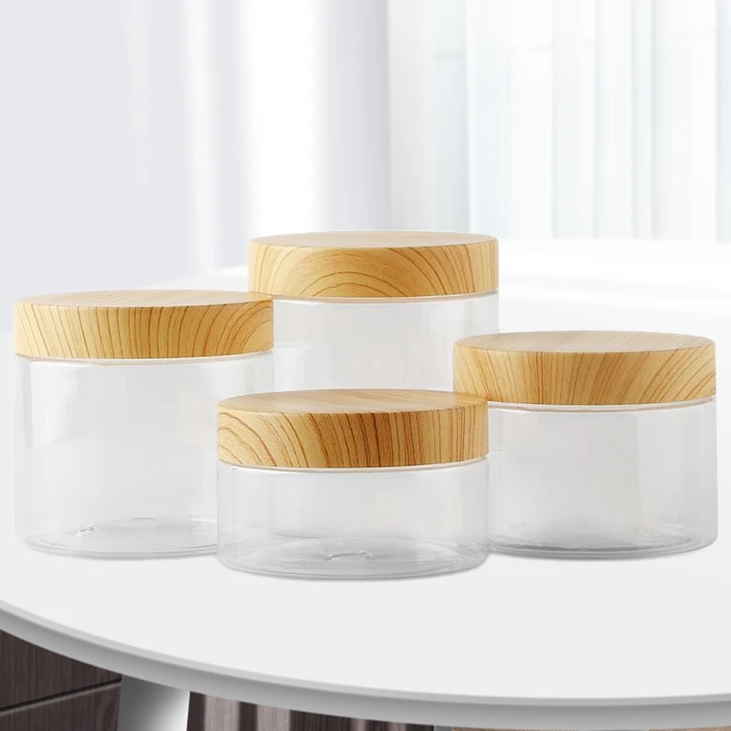 Pusta przezroczysta plastikowa butelka ciała 100ml/200ml/300ml/500ml z drewnianym pojemnik z pokrywą do kuchni do jedzenia butelki do przechowywania herbata kawa