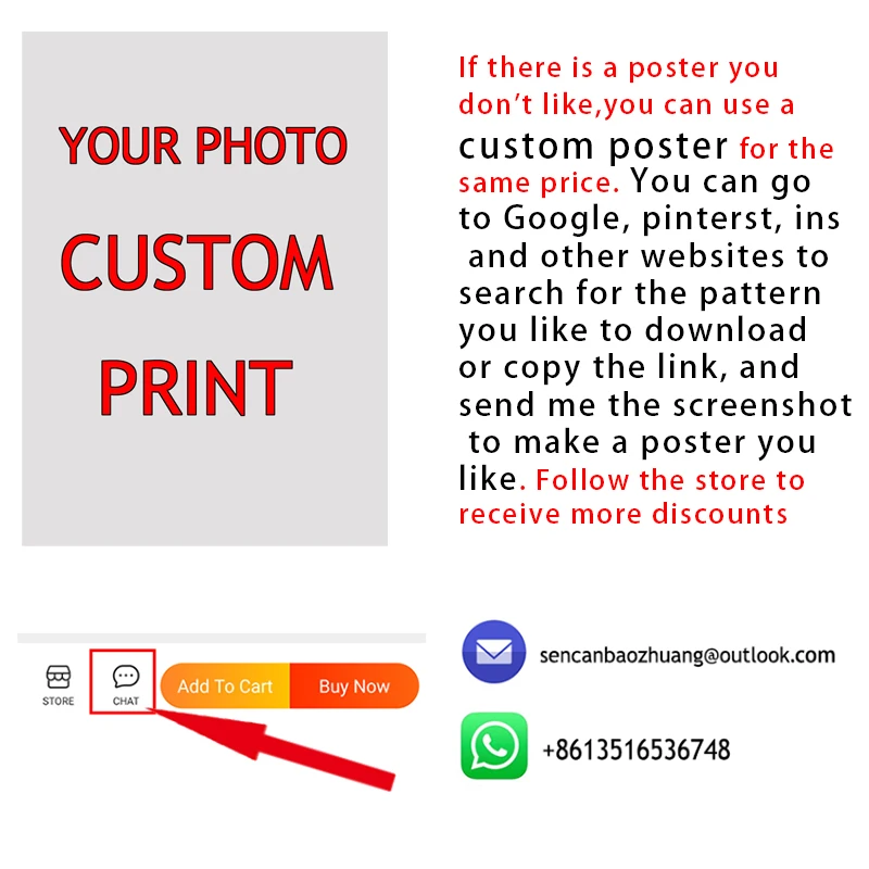 Jeśli jest plakat, który nie pasuje, możesz użyć niestandardowy plakat, cena jest taka sama. Możesz przejść do Google, pinterst, ins i innych stron internetowych, aby wyszukać wzór, który chcesz pobrać lub skopiować link, i wysłać mi zrzut ekranu, aby zrobić plakat, który ci się podoba. Śledź sklep, aby otrzymać więcej rabatów