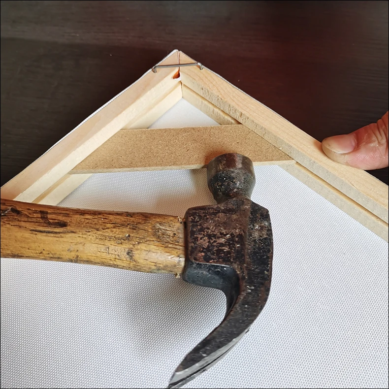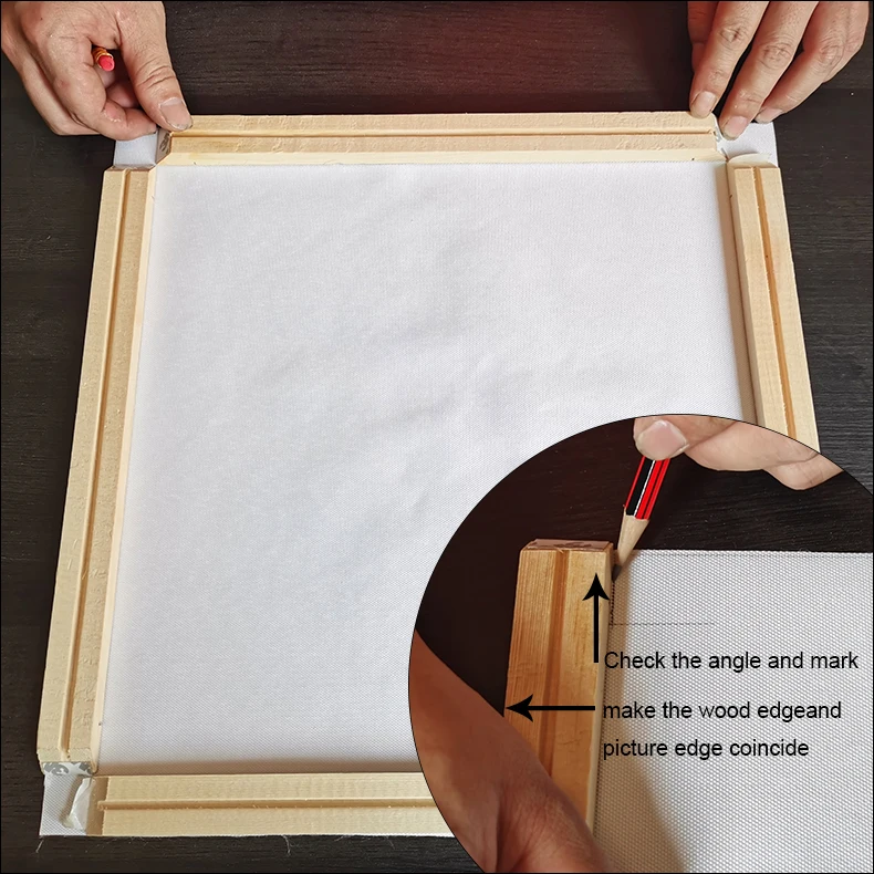 Odwróć obraz i zaznacz położenie drewna na farbie za pomocą długopisu. Upewnij się, że narożnik powierzchni drewna i krawędź drewna pasują do krawędzi obrazu. (Wewnętrzna rama musi być bezszwowa) jest to bardzo ważne.