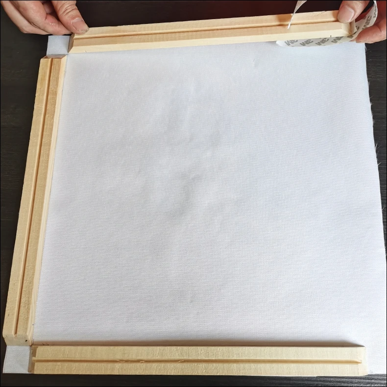 PleaseConfirm lokalizacji. Oderwij podwójną taśmę jeden po drugim. Następnie upewnij się, że kąt obrazu pozostaje między kątami drewna. Naciśnij drewno bardziej starannie