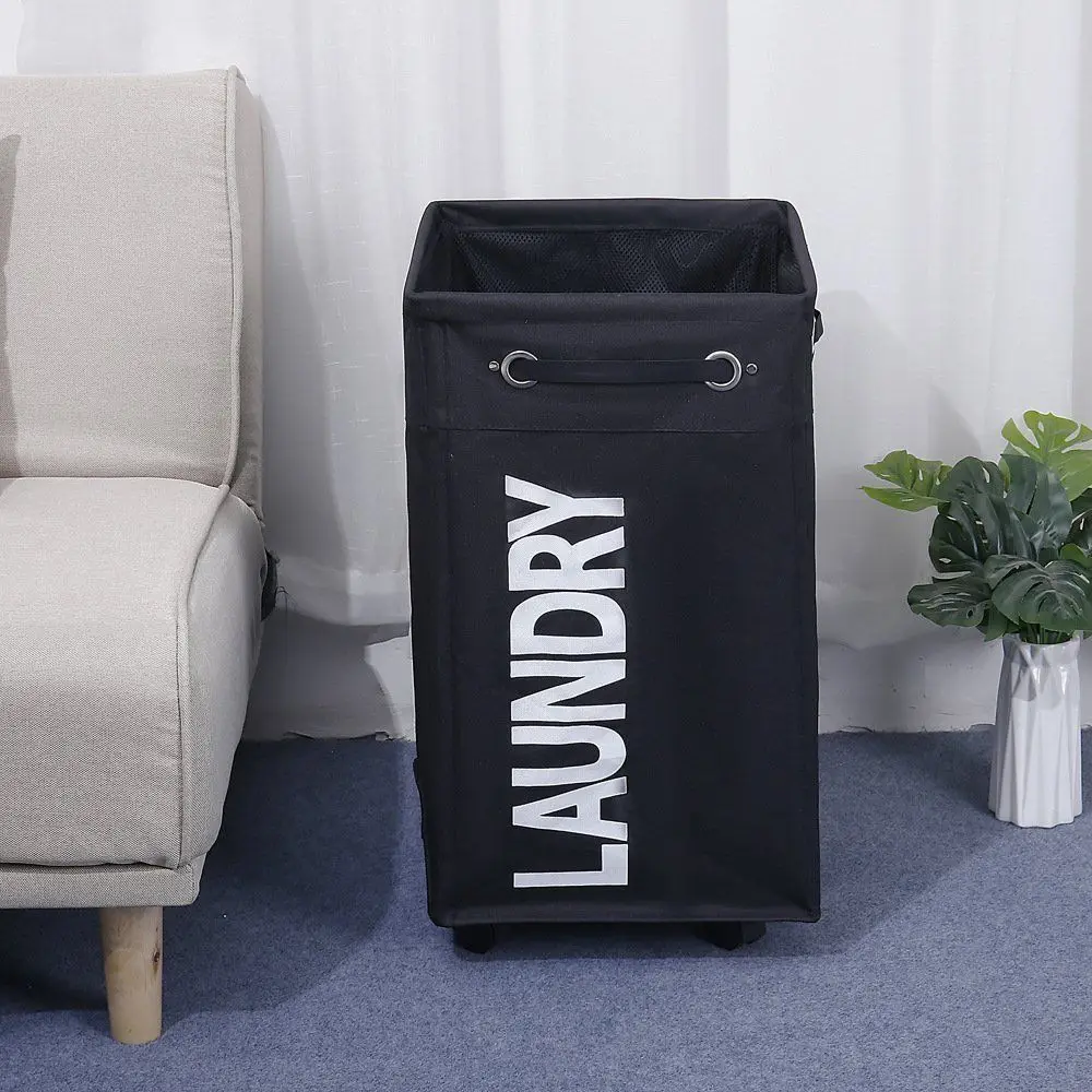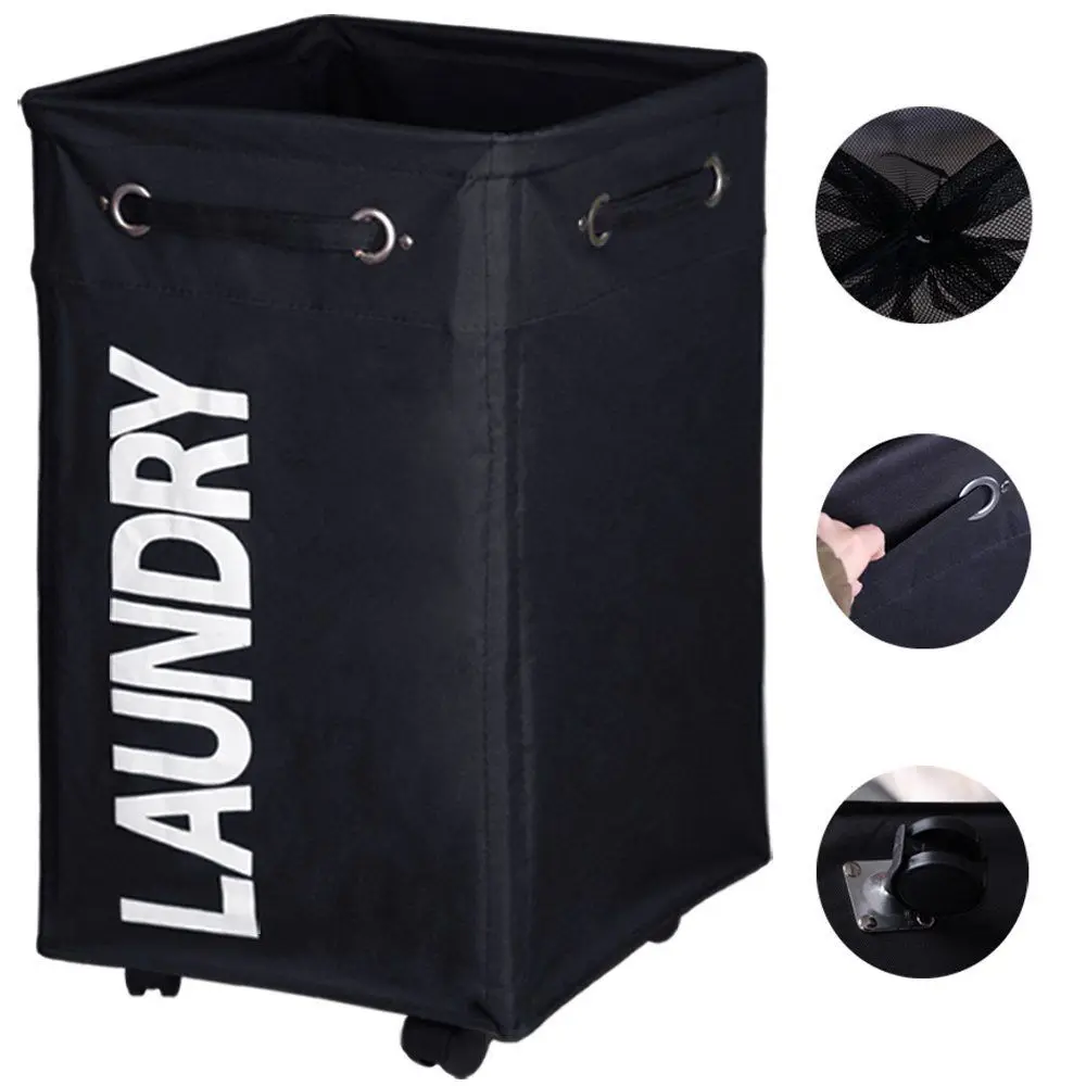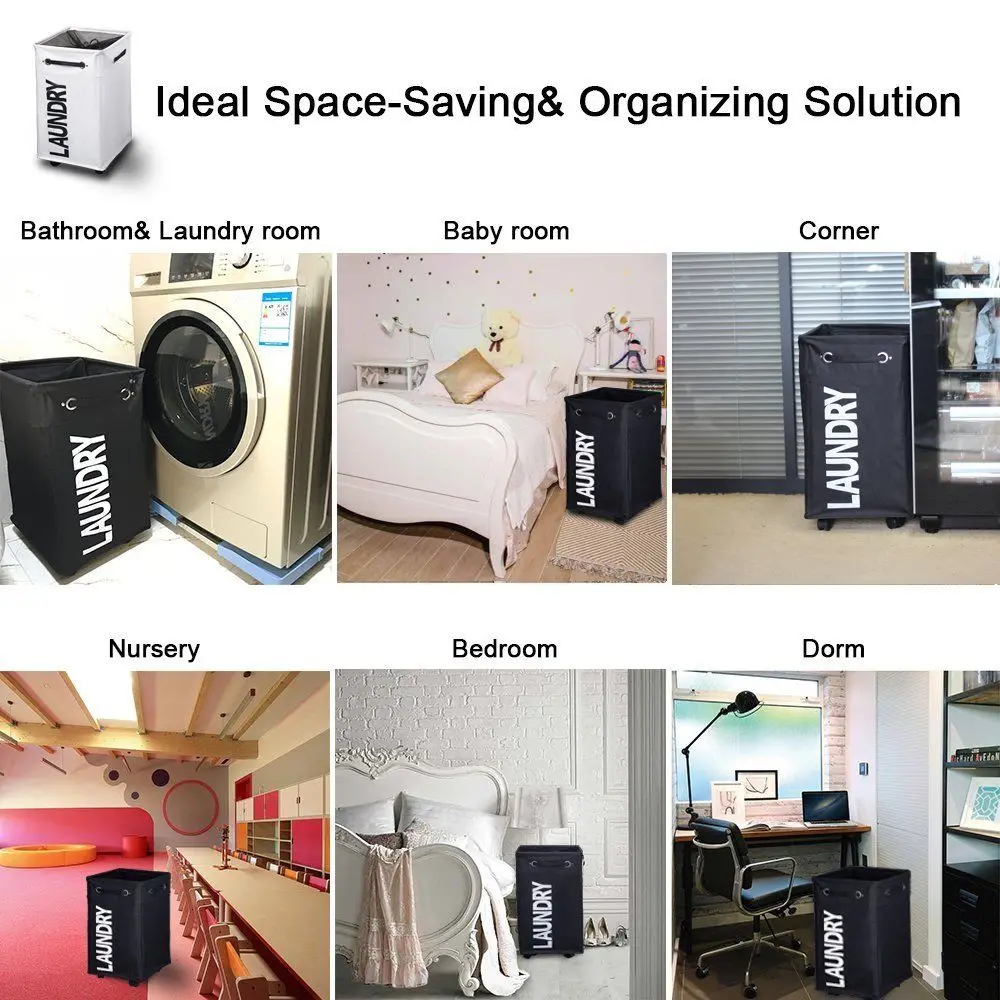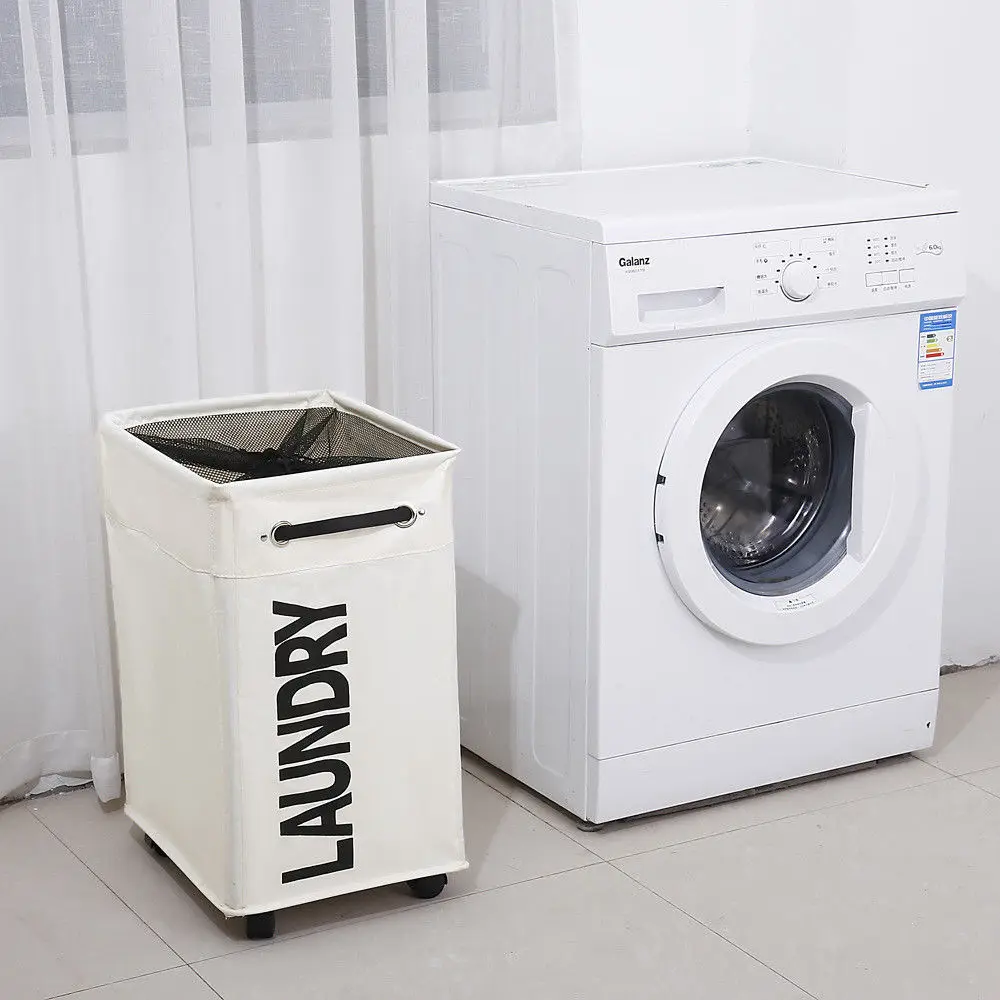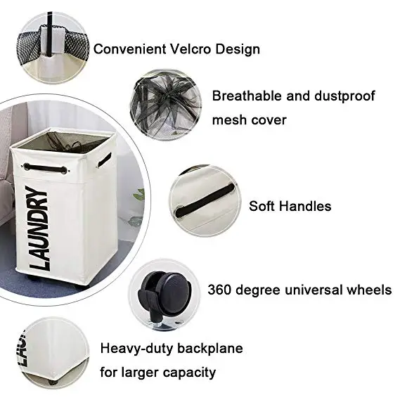 Pakiet zawiera: biały kosz na pranie na kółkach z 4 uchwytami, 4 pręty podtrzymujące