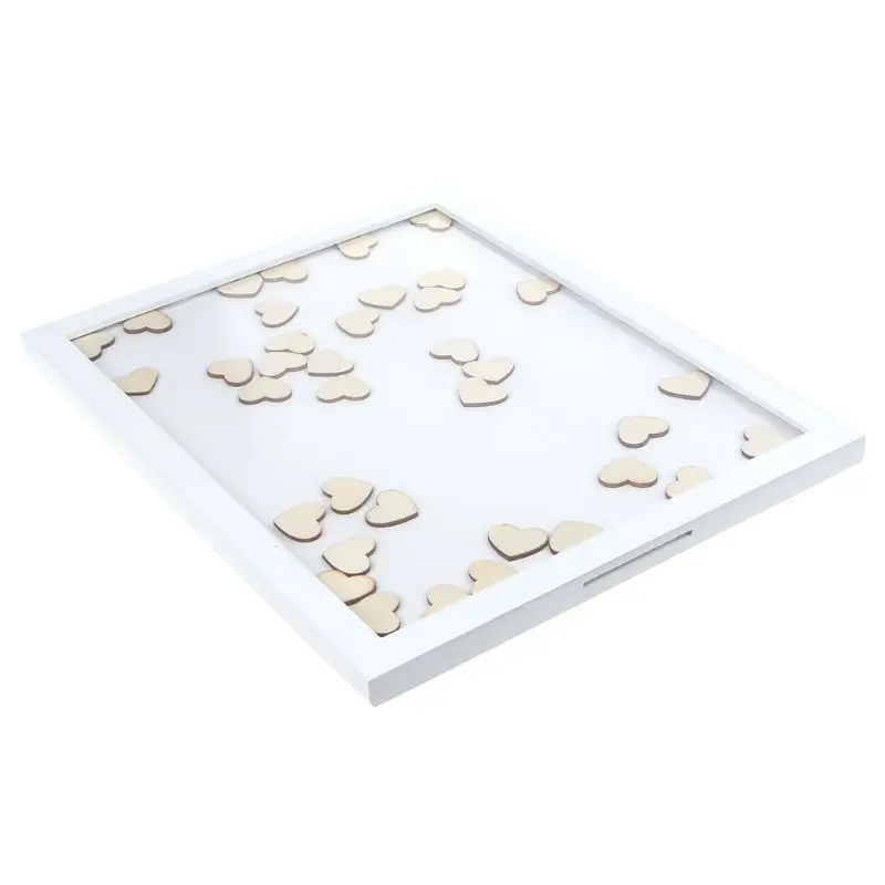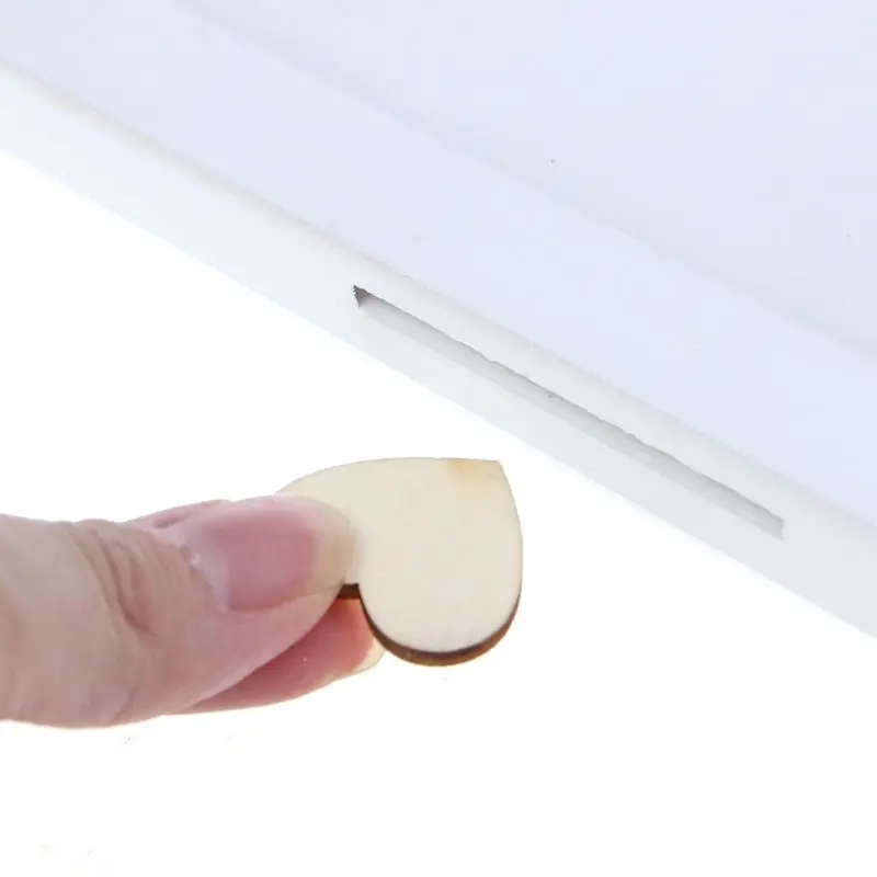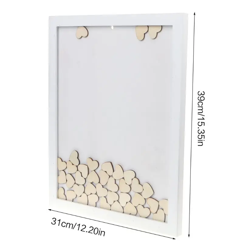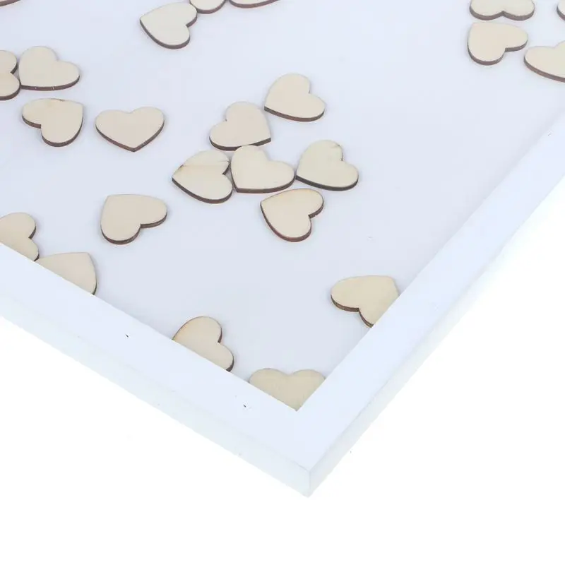 Twoi goście mogą napisać swoje życzenia i nazwiska na puste drewniane serca i upuść je do ramki gościa.