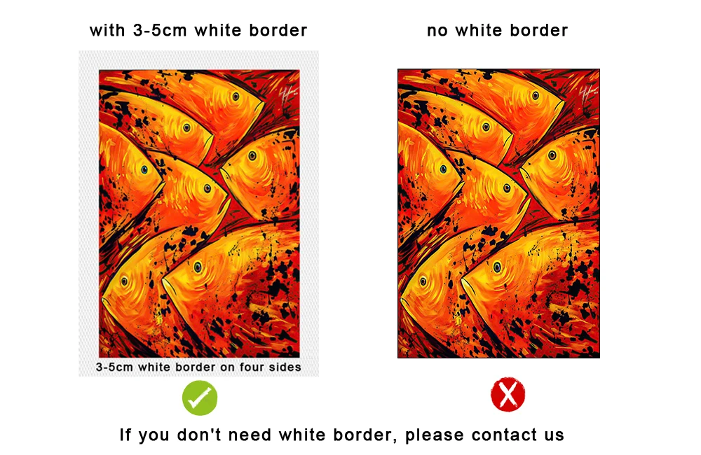 Odpowiedź: w celu sprawiają, że łatwiej jest dla klientów, aby wykonać ramy, zastrzegamy sobie biała krawędź 3-5cm szerokość do klientów przez domyślnie. Jeśli nie potrzebujesz biała krawędź, skontaktuj się z nami.