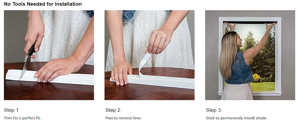 * Przycinaj w domu, aby idealnie dopasować się do wewnątrz lub na zewnątrz rama okienna, a następnie zainstaluj w kilka sekund bez wiertła, śrub lub wsporników-bez narzędzi