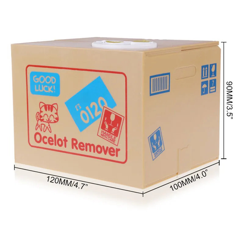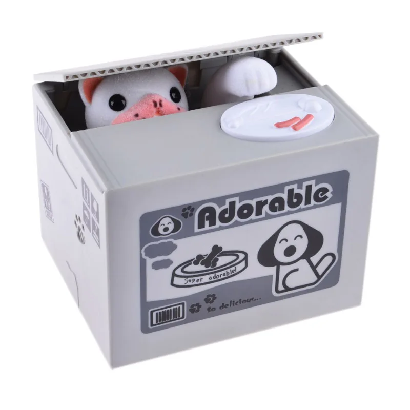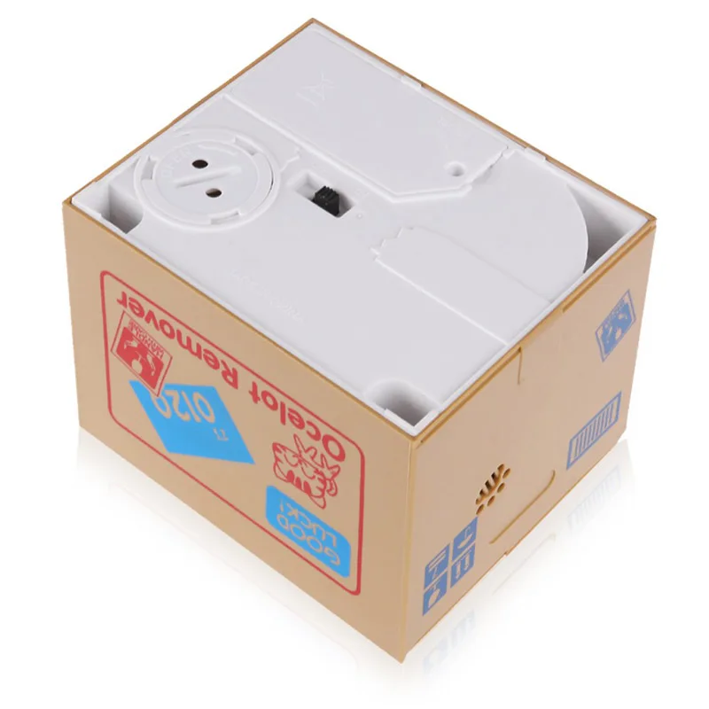 Głowa zwierzęcia unosi się, aby podnieść pokrywa skrzynki, a jej ręka zabierze monetę do pudełka.