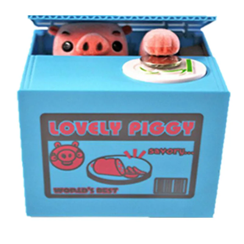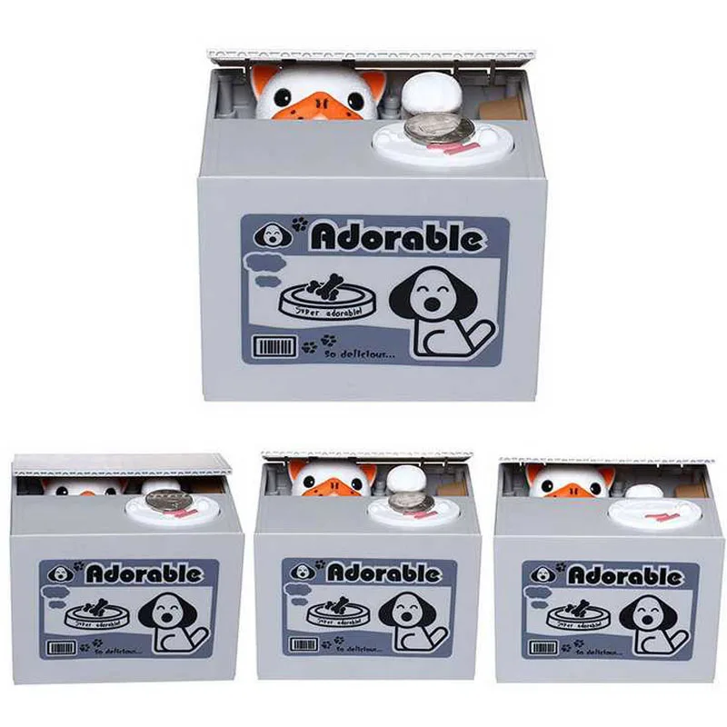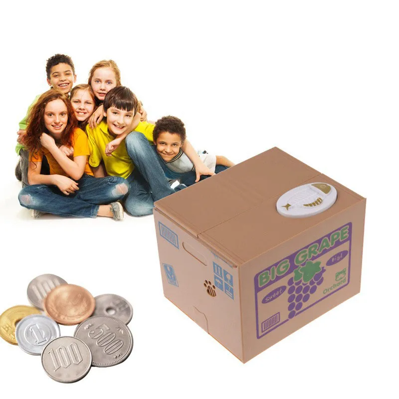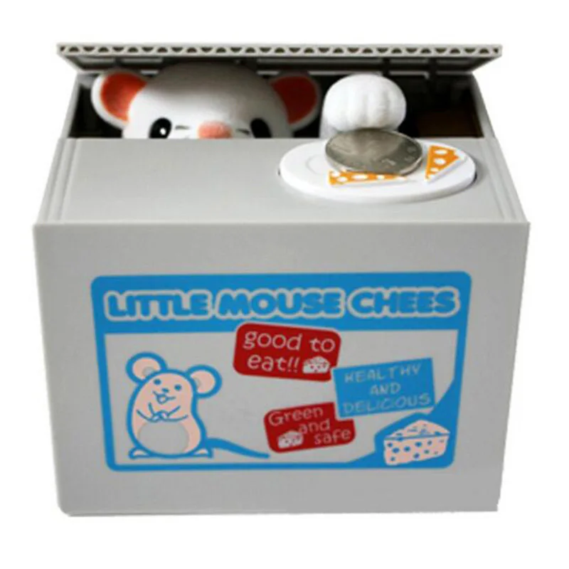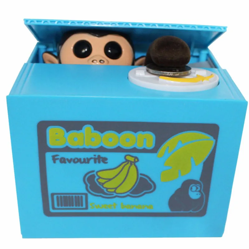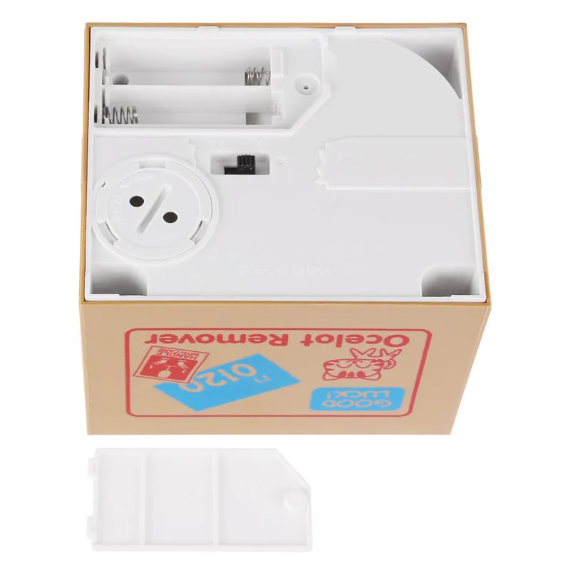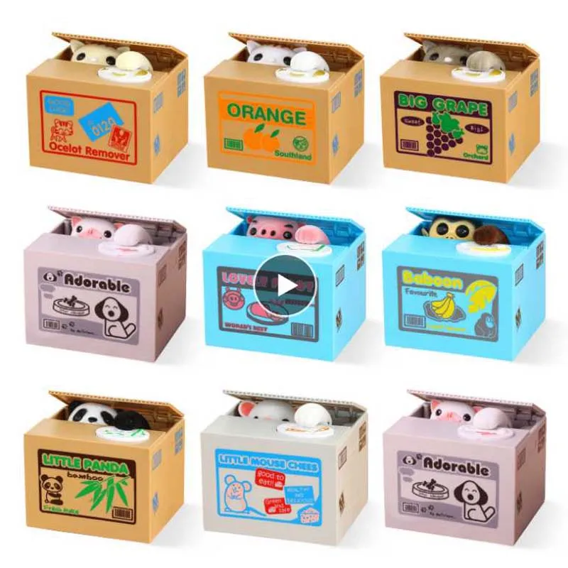 Głowa zwierzęcia unosi się, aby podnieść pokrywa skrzynki, a jej ręka zabierze monetę do pudełka.