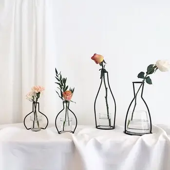 Żelazo Retro Art szklany wazon Terrarium roślina hydroponiczna wazon na kwiaty geometryczny zakład metalurgiczny uchwyt akcesoria do dekoracji wnętrz nowoczesne