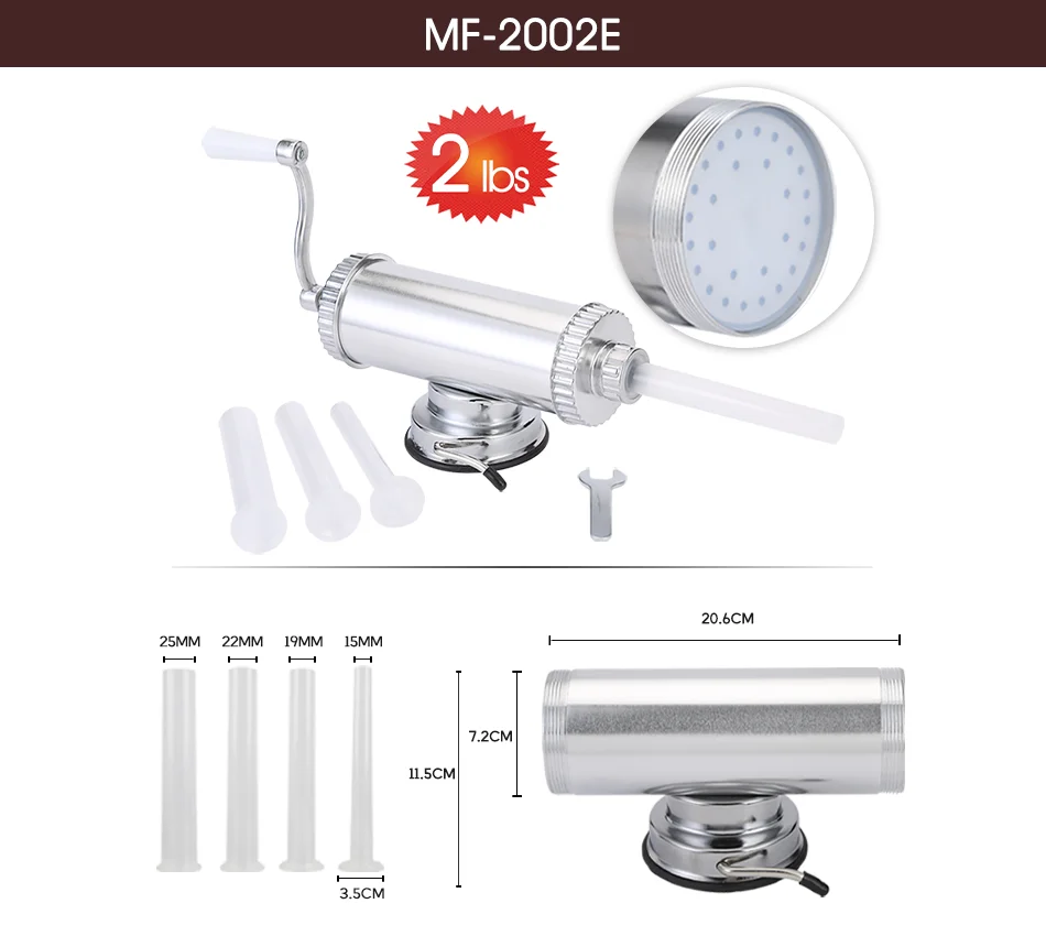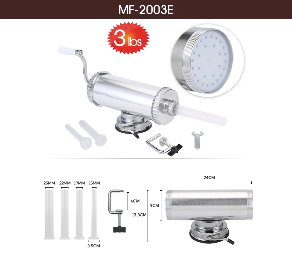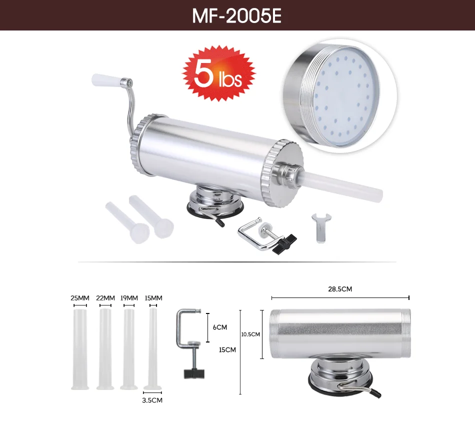 1.0/1.5/2.5 KG domowa maszyna do kiełbasy aluminiowej z podstawą ssącą i 4 dyszami do napełniania tłok silikonowy poziome nadziewarka do kiełbasy