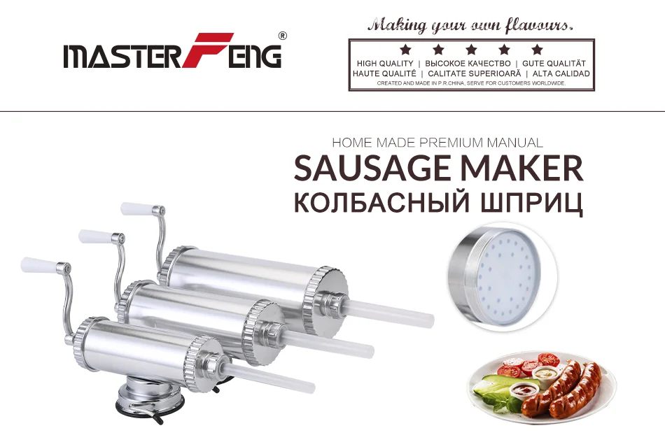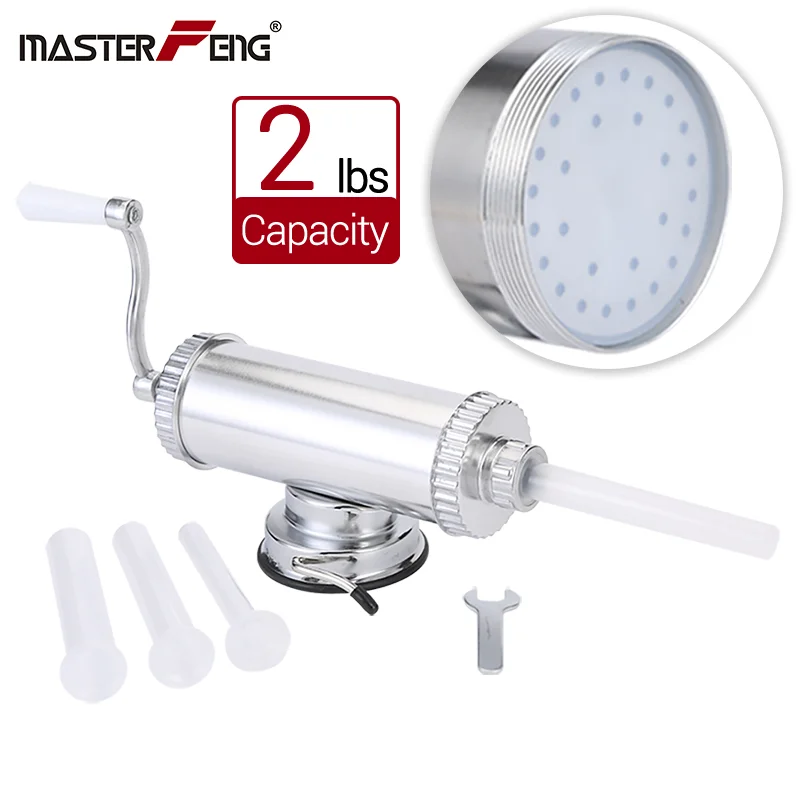 【Łatwa obsługa】 możesz umieścić nadziewarka do kiełbasy z podstawą ssącą na krawędzi gładkiego stół warsztatowy lub stół, obrócić i usunąć przednia okładka nadziewarka do kiełbasy, następnie włóż mięso mielone z przodu nadziewarka do kiełbasy. Następnie obracając uchwyt krzywej zgodnie z ruchem wskazówek zegara, mięso dostanie się do obudowy z dyszy, twoje piękne świeże kiełbaski są gotowe w ciągu kilku minut.