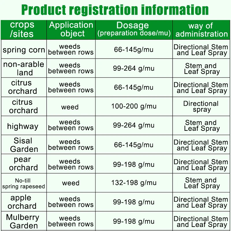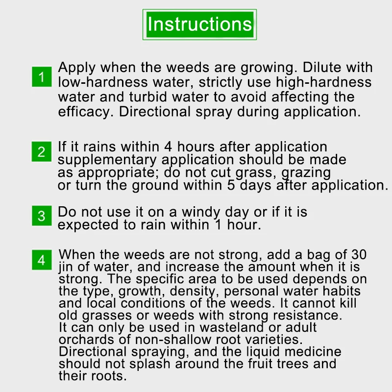 3. W przypadku rocznych chwastów, takich jak chwasty, foxtails, dziewice, begonie, crabgrass i prosięta, dawka wynosi 10g/100m składników aktywnych.
