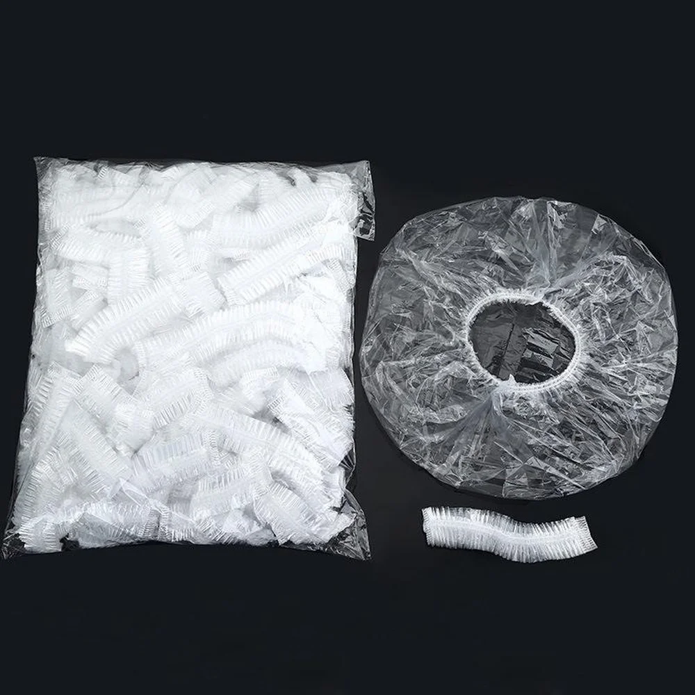 100 sztuk jednorazowy czepek prysznicowy plastikowy wodoodporny nakrycia głowy Hotel włosów czepek przeźroczyste tworzywo sztuczne Salon kosmetyczny Cap Cling