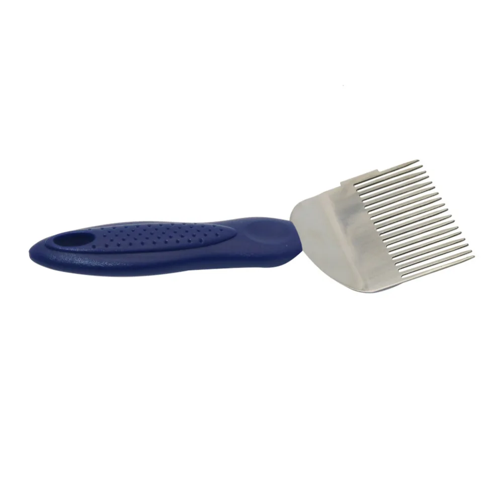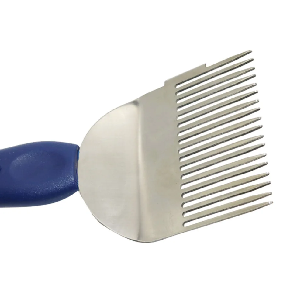 Ten widelec może pomóc w usunięciu komórek do kontroli i zgrabieniu nadmiaru zamknięcia przed skrobaniem miodu.
