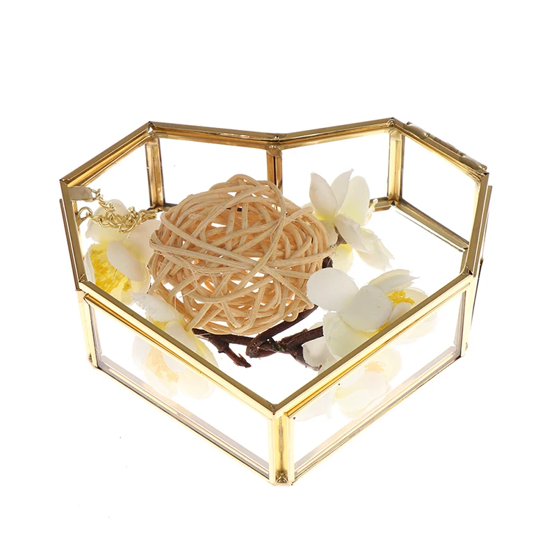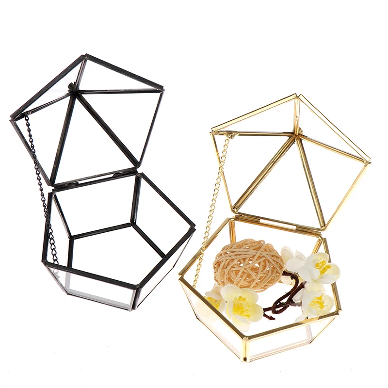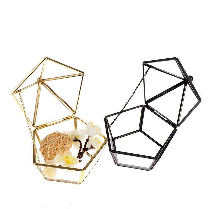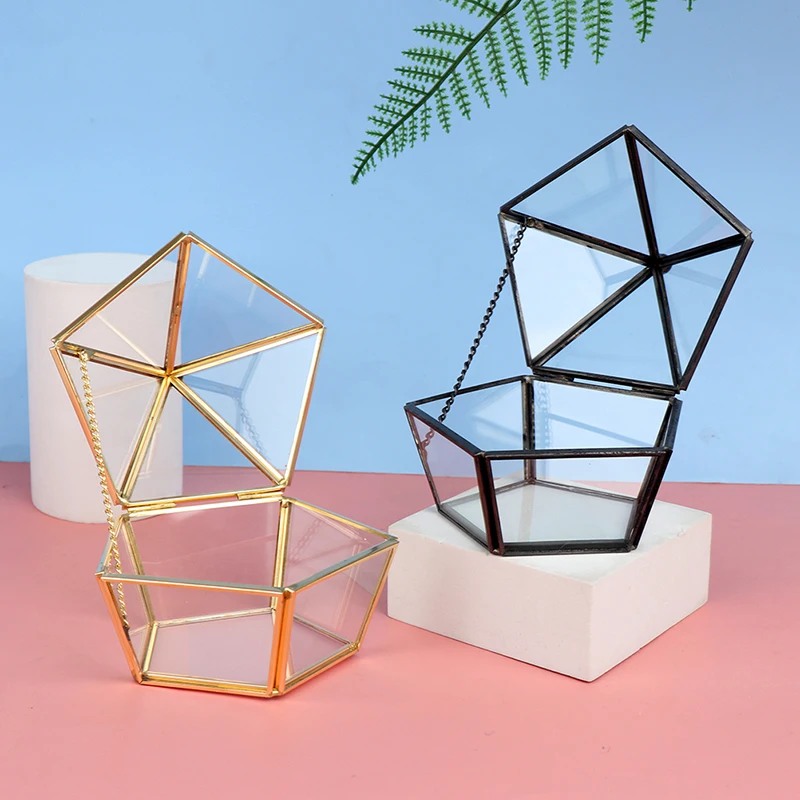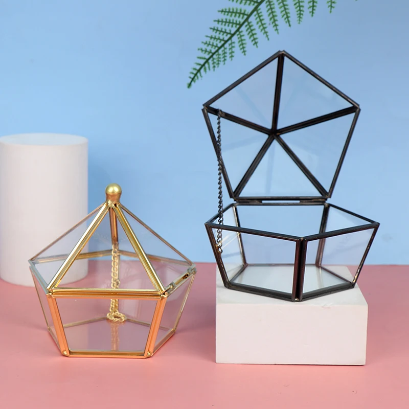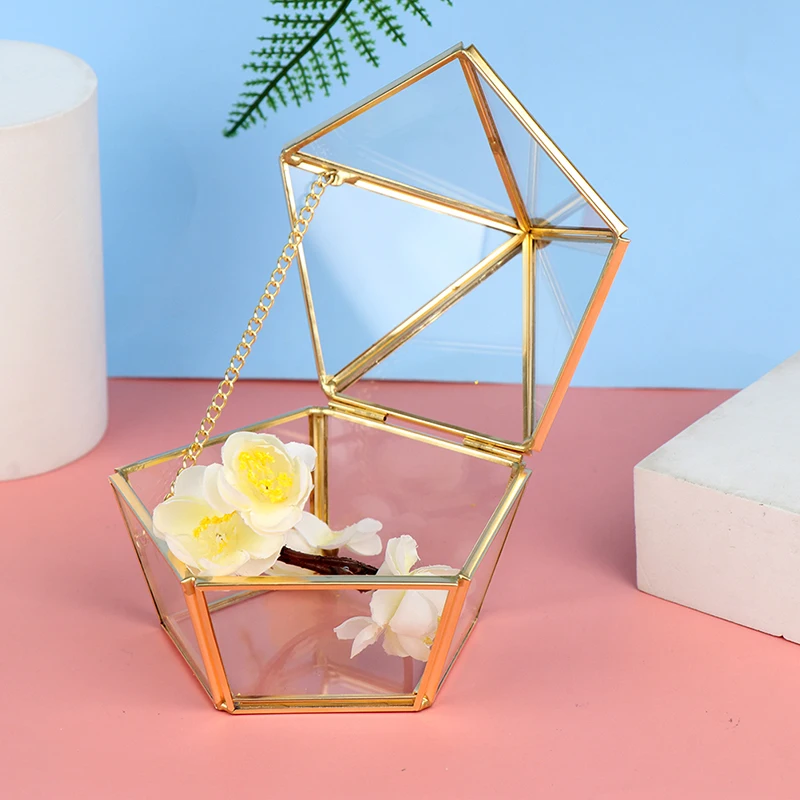Wysokiej jakości materiał: pentagonu pudełko z biżuterią wykonana jest z wysokiej szkło wysokiej jakości i cooper materiał, który jest właścicielem dobre tekstury i długo przy użyciu życie ma dłuższą żywotność. Przezroczysta rama ze szkła i złota miedź razem budują delikatne pudełko z biżuterią pentagonu.