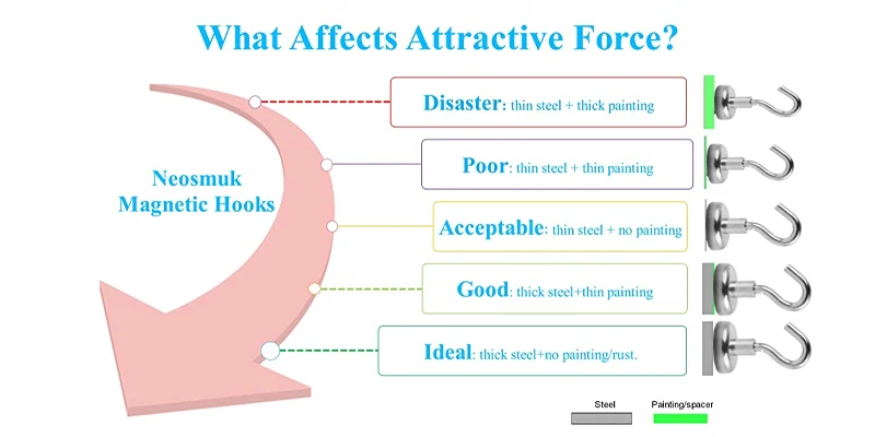 Proszę być rozsądnym przy przyklejaniu haczyki magnetyczne do cienkiej stali z grubym i gładkim malowaniem na boki, jak lodówka, szafa na dokumenty… itp., ponieważ większość strumienia jest marnowana w powietrzu!