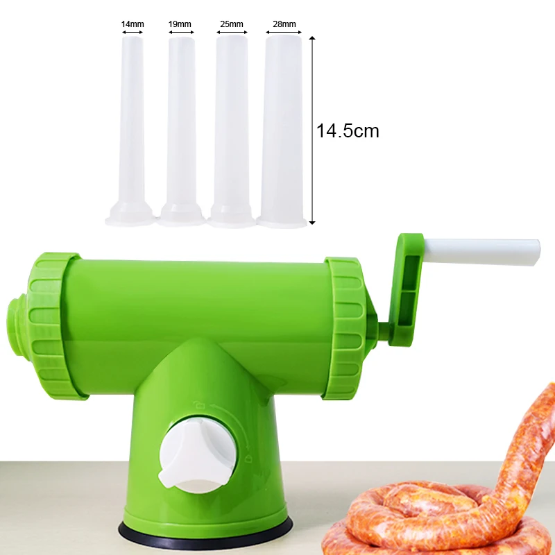 Napełnij kanister mięsem z kiełbasy, przesuń obudowę na dyszę i obróć uchwyt, aby wypełnić; Prowadnik obudowy ręcznie, aby zapobiec pękaniu; Krawat na żądanej długości podstawy ssącej i uchwyt korby dla łatwego użytkowania.