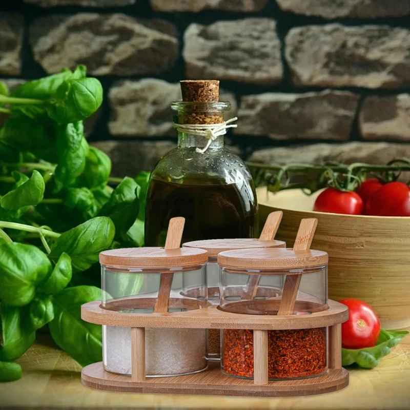 Szklane przezroczyste pojemniki przyprawowe z bambusowymi łyżkami pokrywki podzielone słoik na przyprawy
