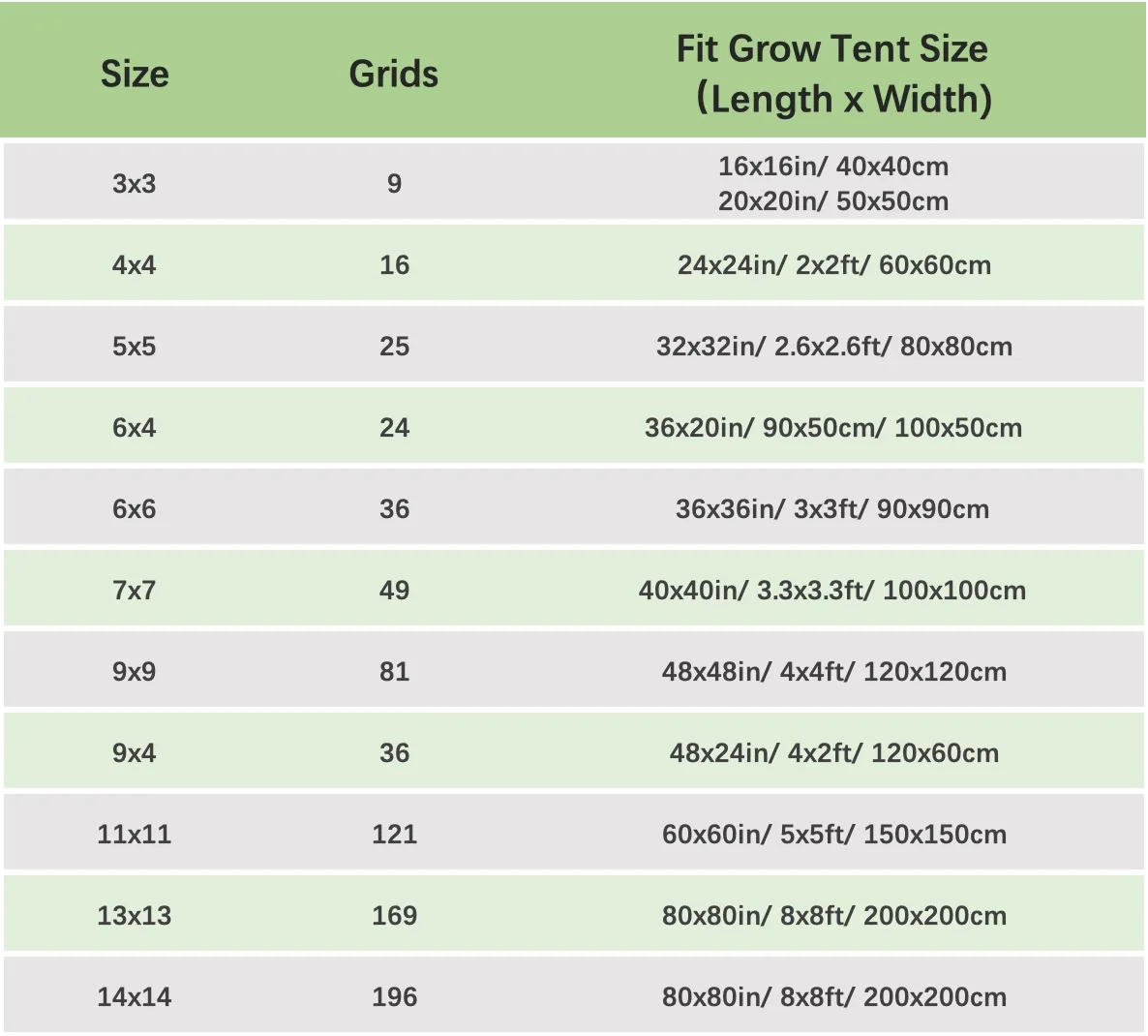 Na przykład (np.), jeśli masz namiot o wymiarach 80x80x160cm, potrzebujesz siatki kratowej 5×5 25.