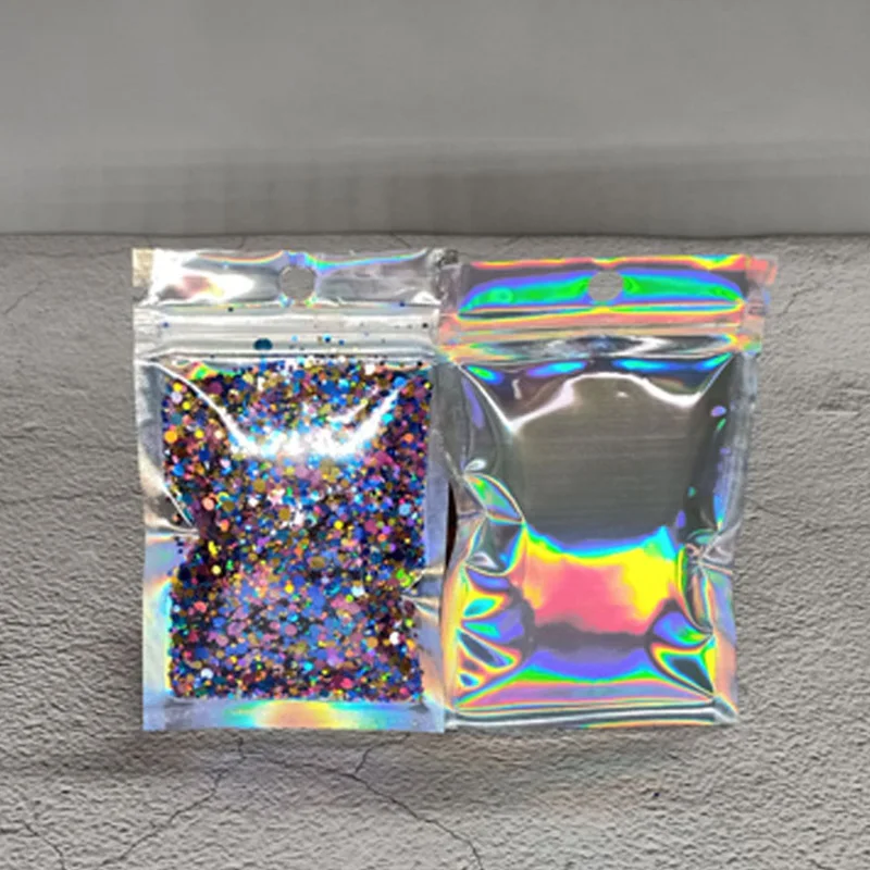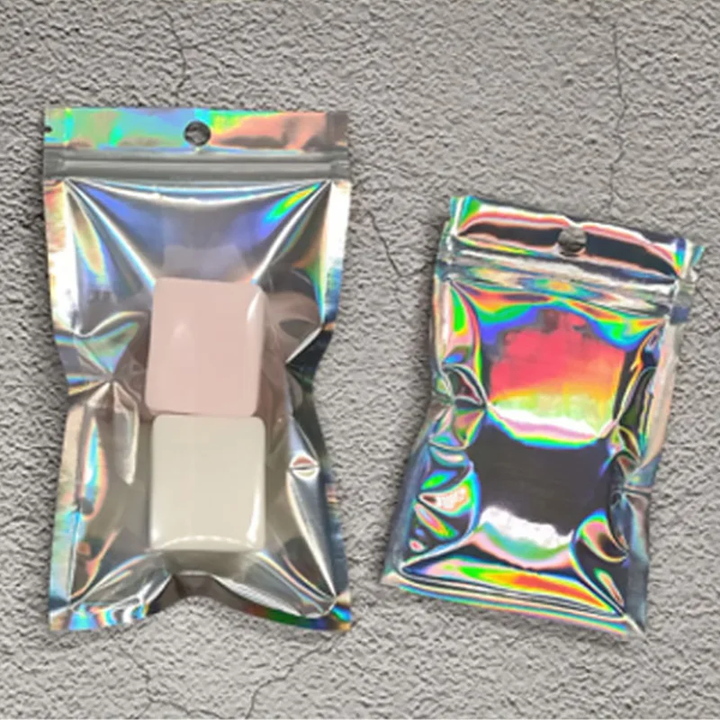 50 szt. Laserowe opakowanie strunowe opakowanie kosmetyczne samoklejący worek prezentowy przezroczysta biżuteria holograficzna gruba folia aluminiowa torby na zamek